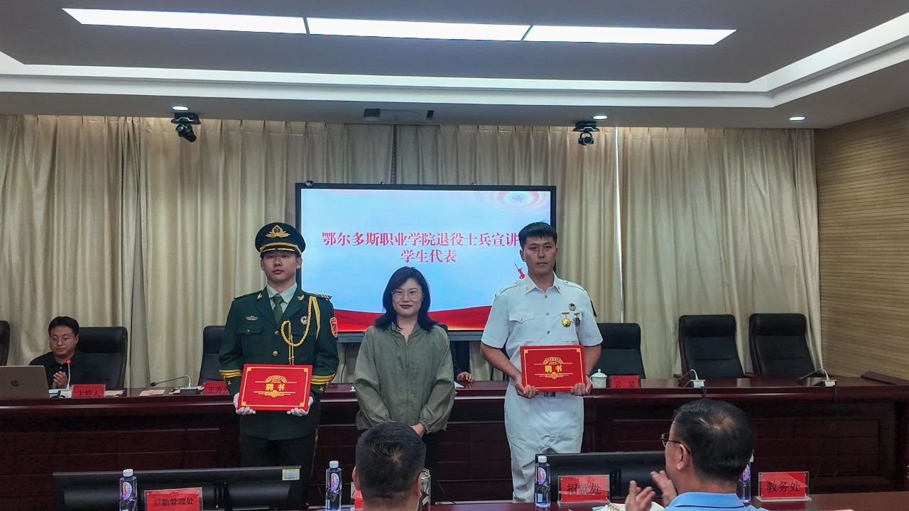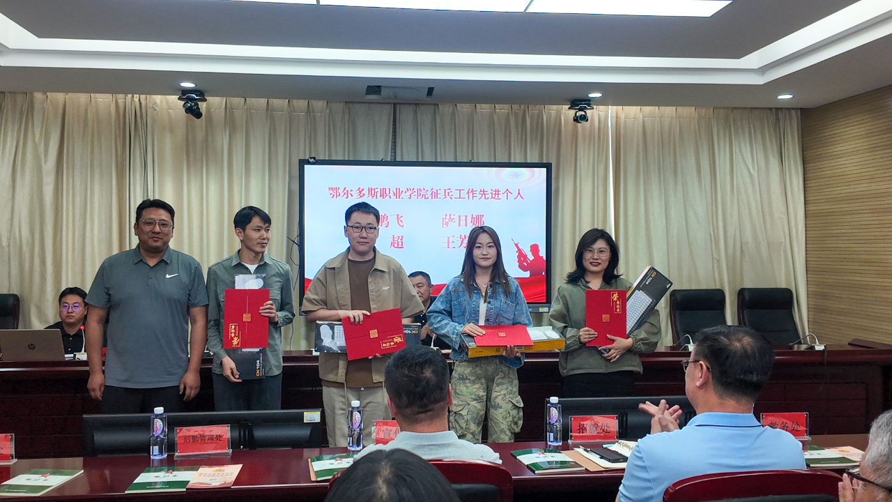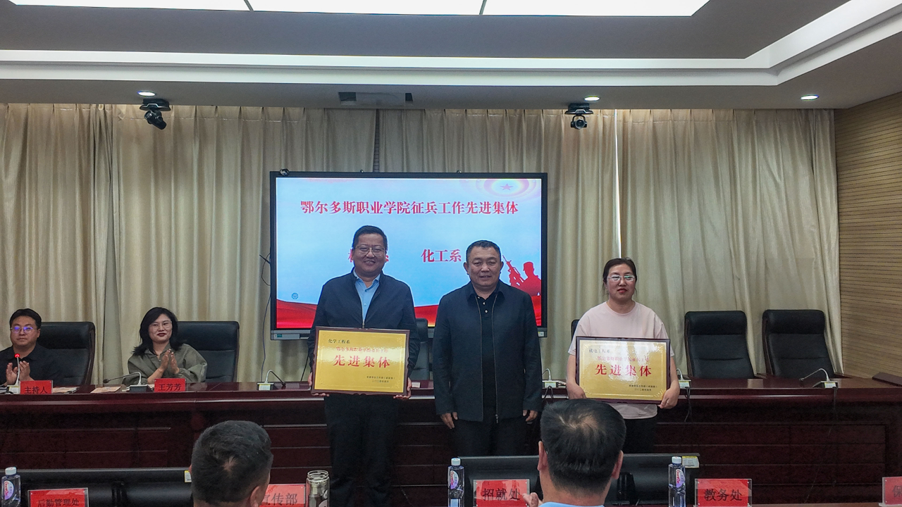 会议表彰了近一年来我院征兵工作取得突出成绩的集体和个人,并为我院退役士兵宣讲团学生代表颁发聘书。机电工程系、化学工程系荣获“征兵工作先进集体”;资源工程系、信息工程系荣获“退役士兵服务先进集体”;汽车工程系萨日娜、建筑工程系王鹏飞、人文管理系李超、党委学生工作部(武装部)王芳芳荣获“征兵工作先进个人”。