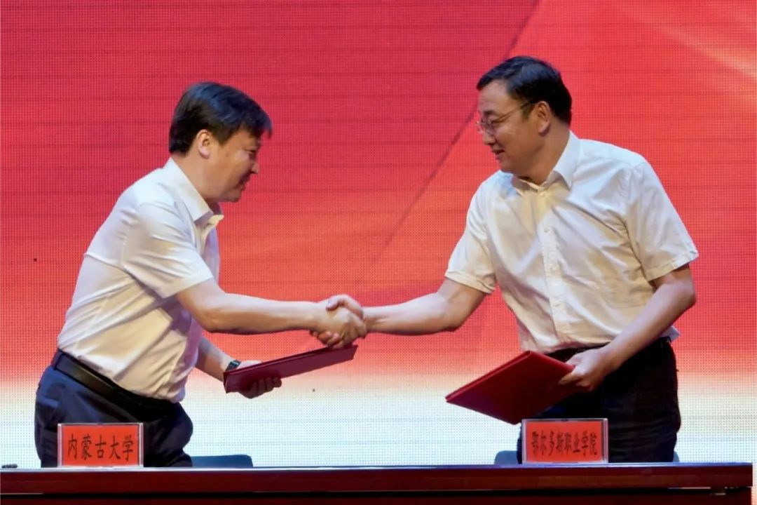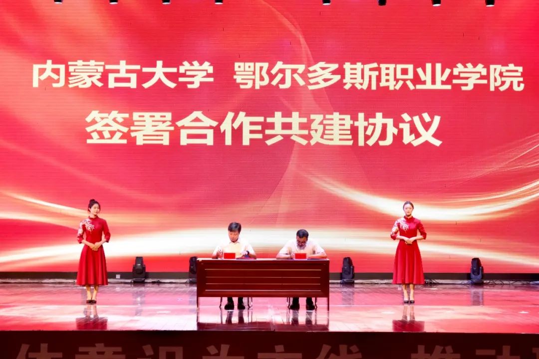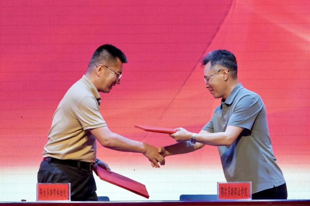 马建峰与内蒙古大学党委委员、副校长达胡白乙拉,宋希文与鄂尔多斯市博物院常务副院长李锐签署合作共建协议。