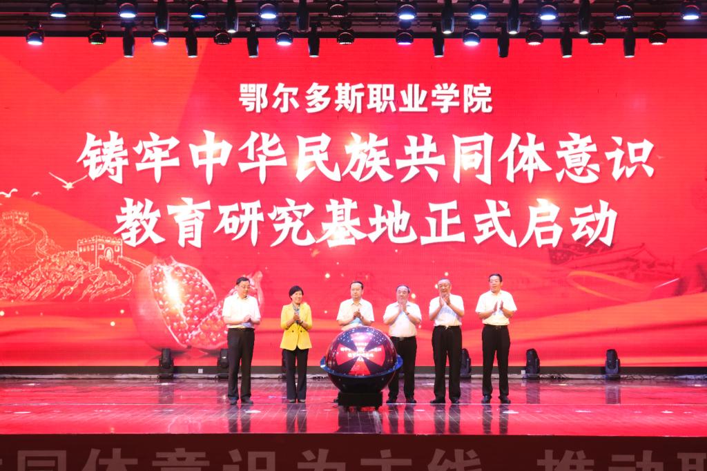 高占胜、刘志彧、布仁其木格、乔明、万世斌和马建峰共同触摸启动球,宣布学院铸牢中华民族共同体意识教育研究基地正式启动。