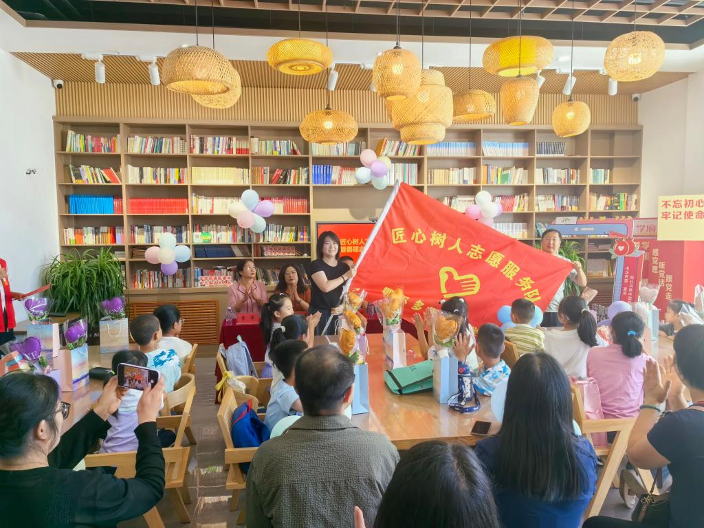 仪式现场,杭刚为学院“匠心树人”志愿服务队授旗。