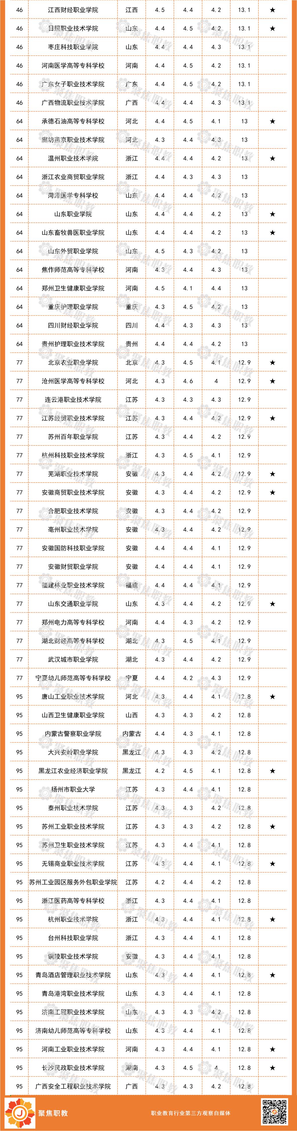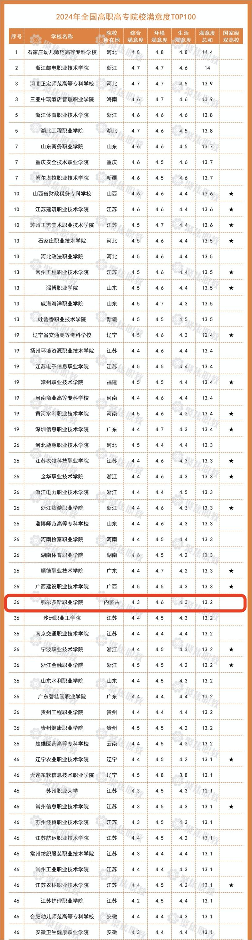 “聚焦职教”微信公众平台根据“阳光高考”网关于各院校学生对所在学校环境、生活品质以及综合情况等方面的实名投票和真实评价,整理出职业院校的评价数据,网站显示评价结果的共有1281所职业院校,该平台整理出2024年全国高职高专院校满意度排行榜前十以及TOP100。