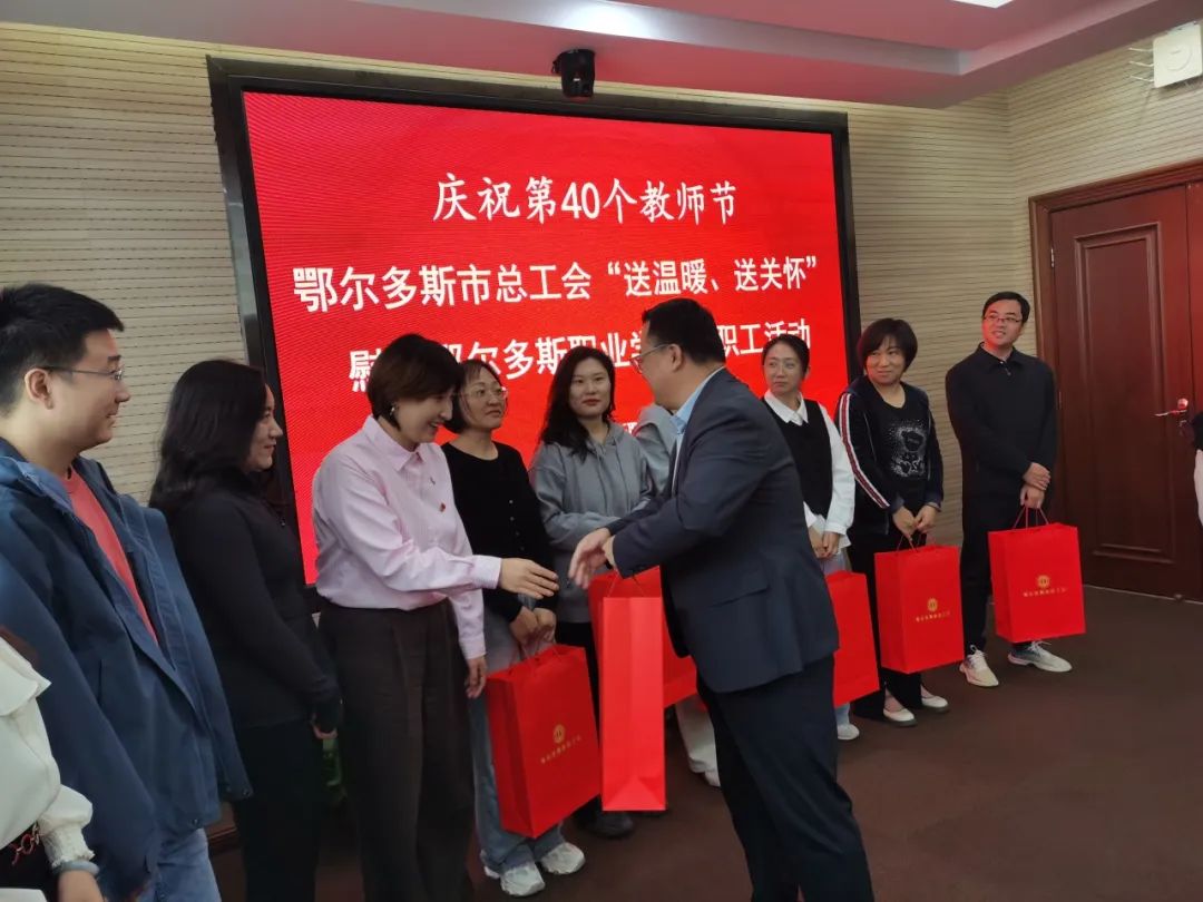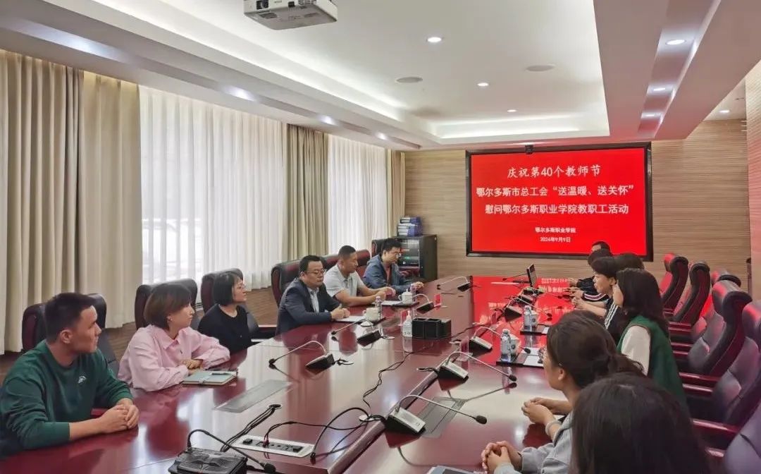 在第40个教师节来临之际,鄂尔多斯市总工会副主席白国东一行于9月9日上午来学院开展“送温暖、送关怀”慰问教职工活动,学院党委副书记陶文辉、工会主席李萍参加慰问,优秀教师、优秀教育工作者、优秀辅导员代表接受慰问。