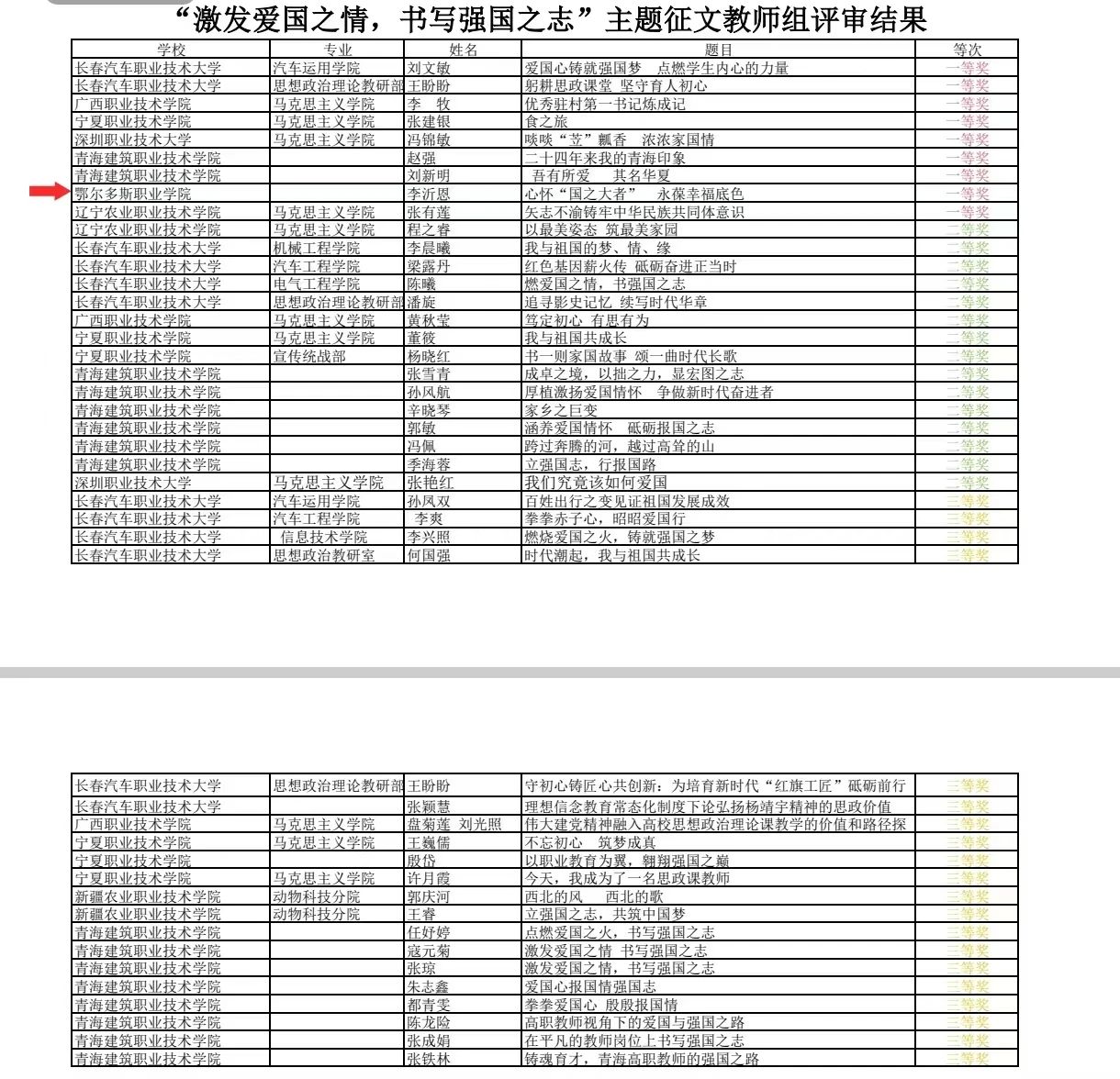 近日,全国高职院校爱国主义教育培训基地合作联盟《2024年“激发爱国之情,书写强国之志”主题征文教师组评审结果》发布,经过初评、复评,我院思政部教师李沂恩申报的《心怀“国之大者” 永葆幸福底色》在众多作品中脱颖而出,荣获全国高职院校爱国主义教育培训基地合作联盟主题征文教师组一等奖。