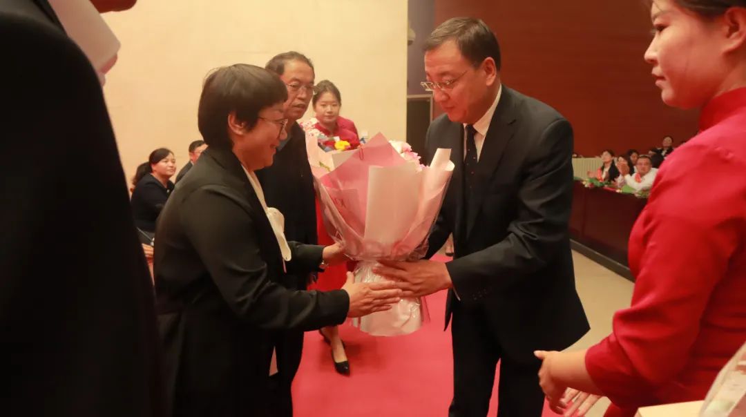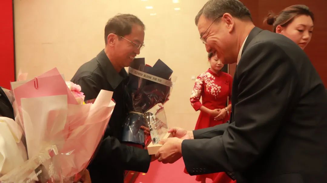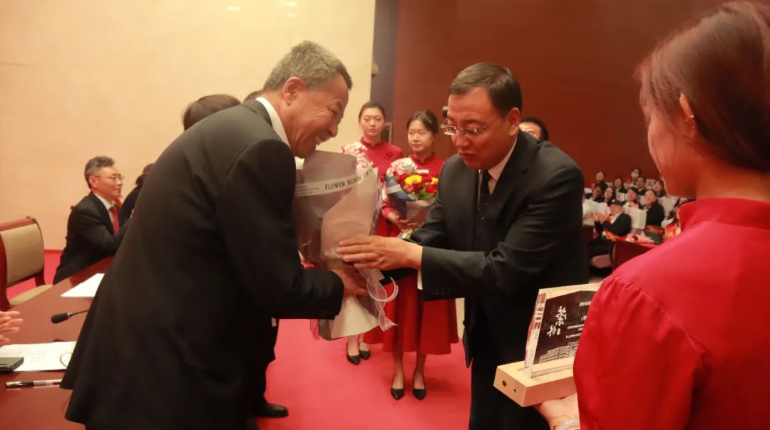 马建峰书记为荣休教师代表送上鲜花和纪念品。