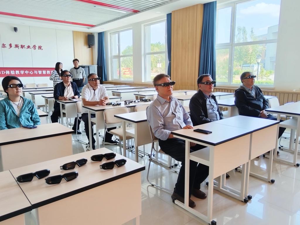 调研组一行走进铸牢中华民族共同体意识教育研究基地,了解学院铸牢中华民族共同体意识工作开展情况以及基地建设情况。在3D虚拟仿真功能教室和VR体验智慧教室,调研组一行体验了模拟数据资源库中的网上展厅内容,对学院通过互动式、体验式等多种形式开展学习宣传教育,将铸牢中华民族共同体意识深深根植于青年学生思想意识中的举措给予高度认可。调研组来到美育基地,认真听取了“美润匠心”品牌创建情况,体验了中华优秀传统文化茶艺的魅力,参观了皮艺(手工)传承工作室,对学院以铸牢中华民族共同体意识为主线,深化课程思政改革,推进五育并举的教育实践给予高度评价。