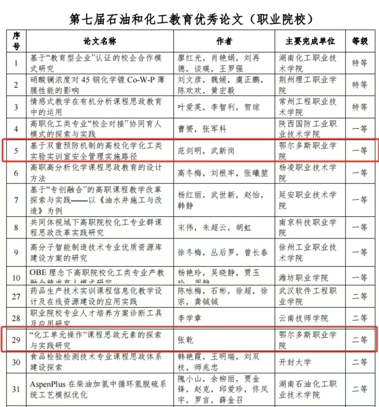化学工程系教师范剑明的论文《基于双重预防机制的高校化学化工类实验实训室安全管理实施路径》荣获一等奖、教师张乾的论文《“化工单元操作”课程思政元素的探索与实践研究》荣获二等奖!