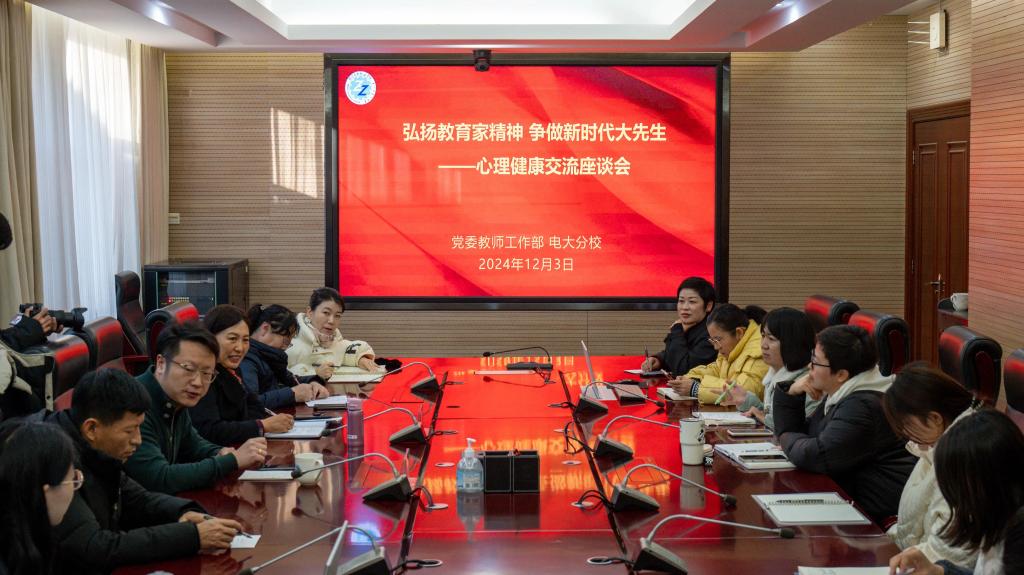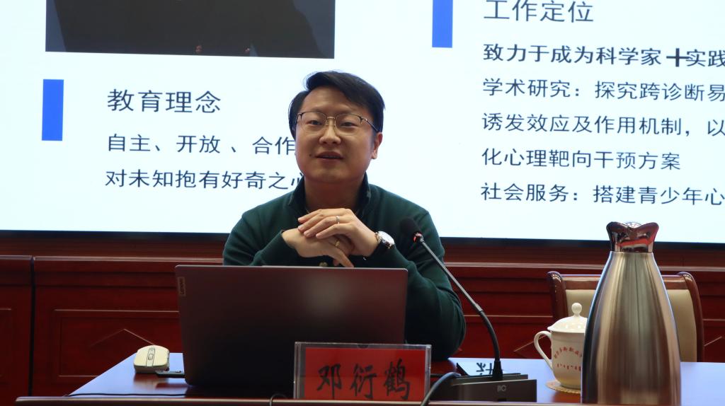 邓衍鹤与学院各系书记、辅导员及心理健康教研室老师就师生心理健康问题进行了座谈交流,并以“弘扬教育家精神,争做新时代大先生”为主题为全院教师开展了“积极心理赋能教师发展,阳光心态点亮幸福之路”专题讲座。