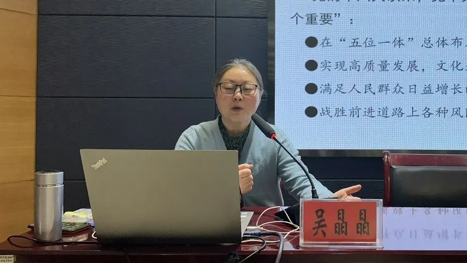 马建峰说,习近平文化思想是新时代党领导文化建设实践经验的理论总结,为做好新时代新征程宣传思想文化工作、推动文化繁荣、建设文化强国提供了强大思想武器和科学行动指南。一要深刻领会和把握习近平文化思想的重大意义和丰富内涵。要自觉将习近平文化思想贯彻落实到学院宣传思想文化工作各方面和全过程,更好落实新时代立德树人根本任务,为推动学院“新双高”建设提供思想保证和强大精神力量。要结合教育教学工作实际,在深学细悟、讲深讲透习近平文化思想丰富内涵和核心要义上下功夫,推动广大党员干部深入领会其中蕴含的立场观点方法,系统把握其战略部署和实践要求,推动相关决策部署落到实处。二要持续抓好习近平文化思想的学习宣传工作。把习近平文化思想纳入学习计划,作为党委理论学习中心组学习、干部培训、党员教育、思想政治理论课和宣传宣讲的重要内容,推动习近平文化思想进教材、进课堂、进头脑,帮助广大师生系统学习、深刻领会习近平文化思想。要持续加强对习近平文化思想的学习、研究、阐释,并自觉贯彻落实到办学治校各方面和全过程,切实做到学思用贯通、知信行统一。三要以习近平文化思想为指导推动校园文化创新发展。持续深化校园文化建设,精心组织开展校园文化育人工程,充分发挥宣传主阵地作用,以文化人,以文育人,组织开展形式多样、健康向上、格调高雅的校园文化活动。要依托学院宝贵历史文化资源,加快建设新的校史馆,推进鄂职文化品牌建设,以宣传思想文化工作高质量发展的丰硕成果彰显习近平文化思想的实践伟力。