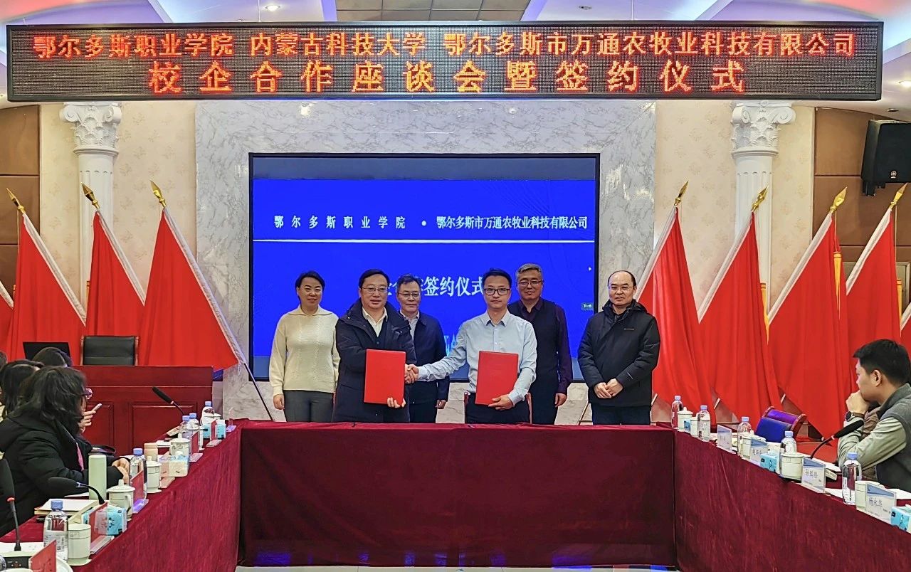 1月13日,学院与内蒙古科技大学、万通农科公司举行共同推动鄂尔多斯全面乡村振兴校企合作座谈会暨签约仪式。学院党委副书记、院长宋希文,党委副书记陶文辉,党委委员、副院长任光飞,内蒙古科技大学发展规划处处长郭江波、发展规划处政策法规科科长徐扬,市水投集团党委委员、副总经理、市农投开发公司董事长杨永华出席会议,各方有关负责同志、专家学者参加会议。市农投开发公司总经理、万通农科公司董事长孙瑞锋主持会议。