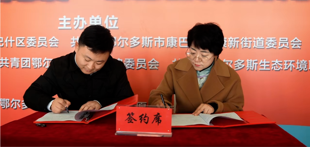仪式现场,康巴什团区委书记刘志雄与学院团委书记赵美丽签订了共青团“校地共建”合作框架协议,并共同发布“暖青志美”志愿服务项目,我院志愿者代表上台认领志愿服务项目,接受授旗。