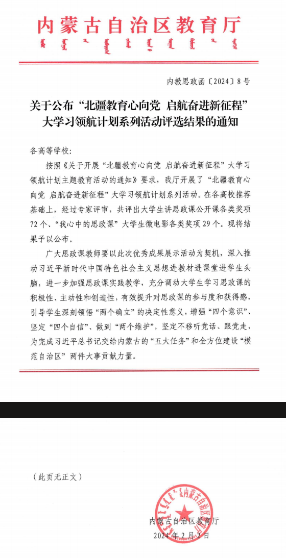 近日,内蒙古自治区教育厅公布了“北疆教育心向党 启航奋进新征程”大学生领航计划系列活动评选结果。我院思想政治理论课教学科研部11位老师指导的“大学生讲思政课公开课”5部作品在此次评选中分别获得一等奖1项、二等奖2项、三等奖2项,此次成绩的取得实现了我院在此赛项中零的突破。