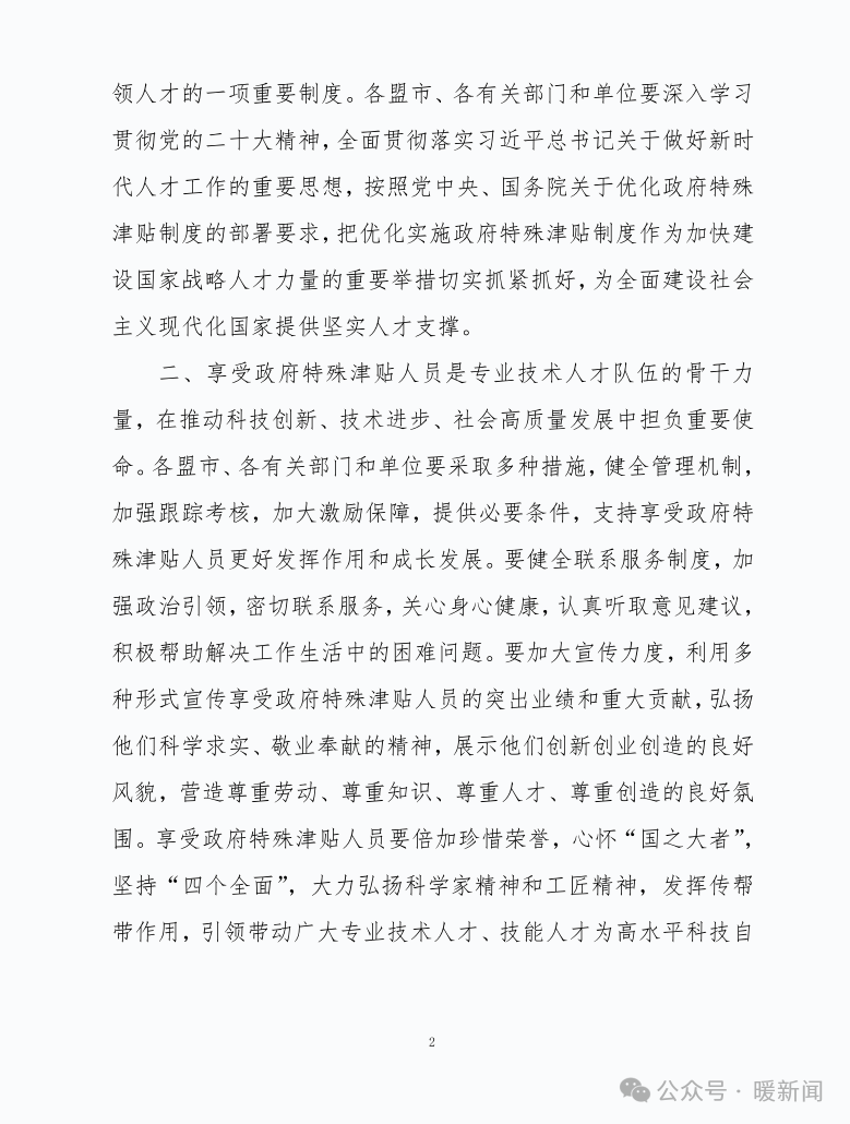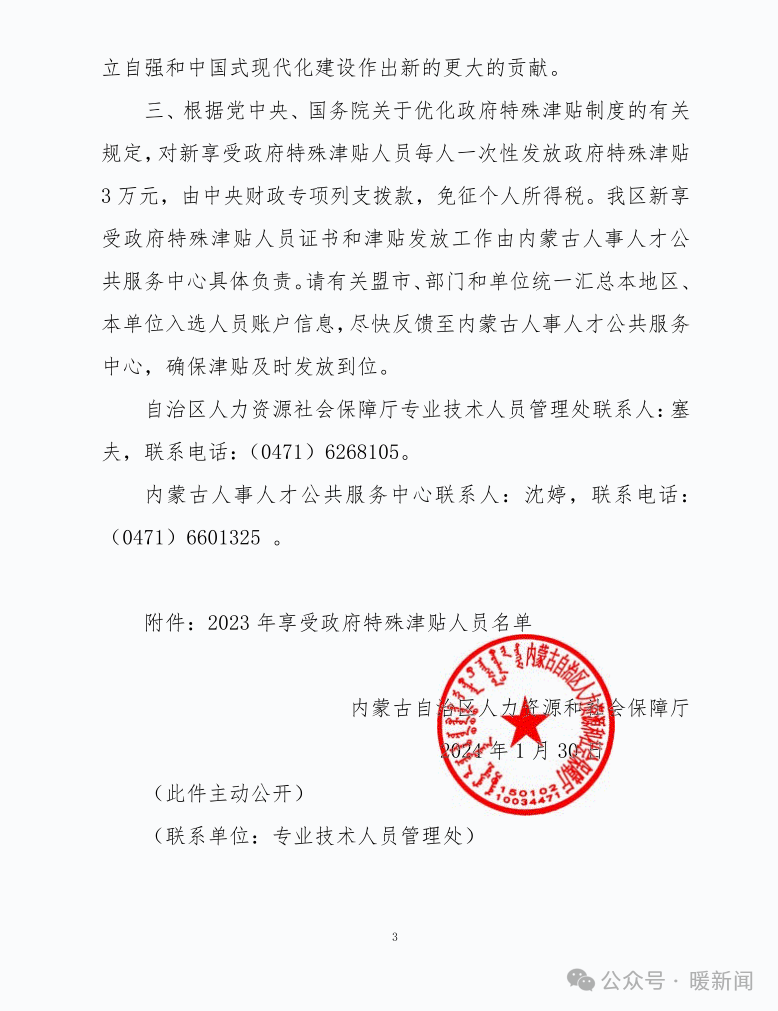 根据党中央、国务院关于优化政府特殊津贴制度的有关规定,对新享受政府特殊津贴人员每人一次性发放政府特殊津贴3万元,由中央财政专项列支拨款,免征个人所得税。