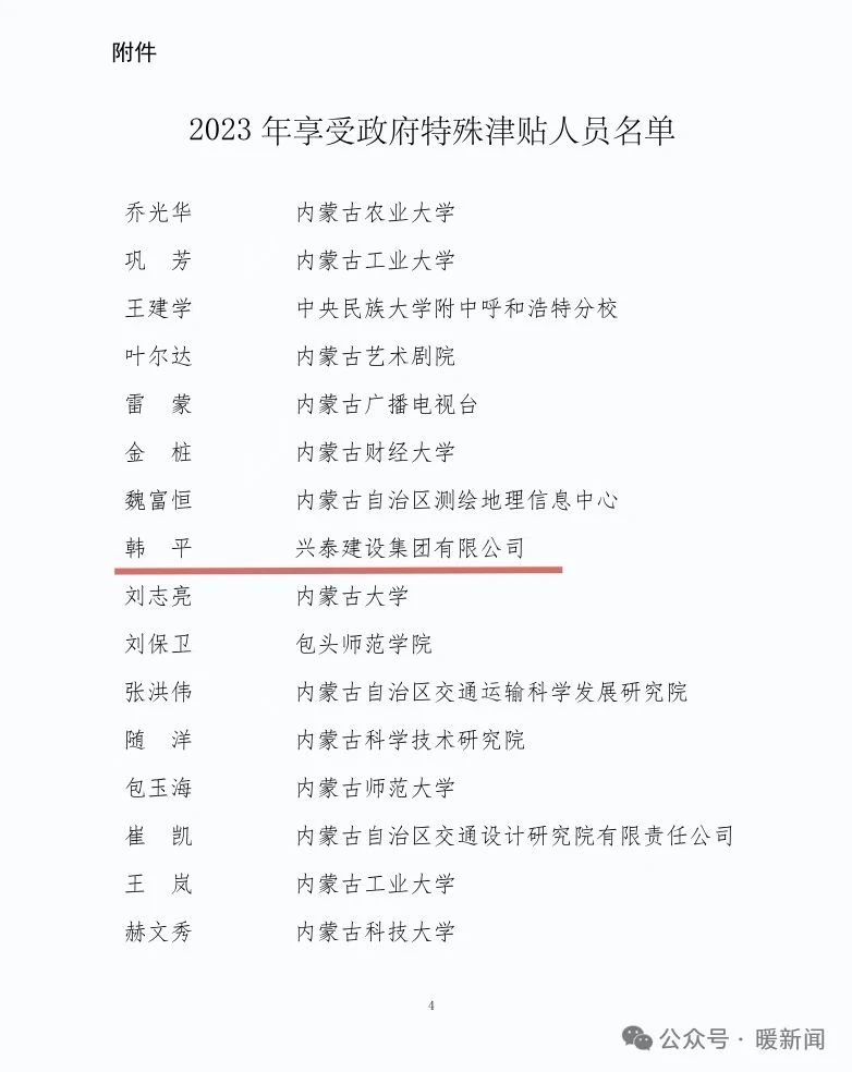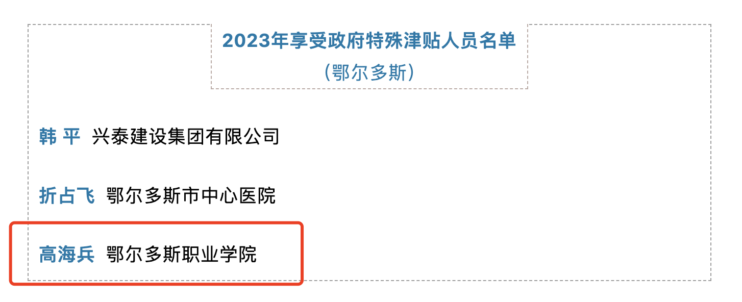 1月30日,内蒙古自治区人力资源和社会保障厅公布2023年享受政府特殊津贴人员名单,经党中央、国务院批准,2023年我区共有52人享受政府特殊津贴,其中,鄂尔多斯有3人,我院机电工程系教师高海兵为其中一人。