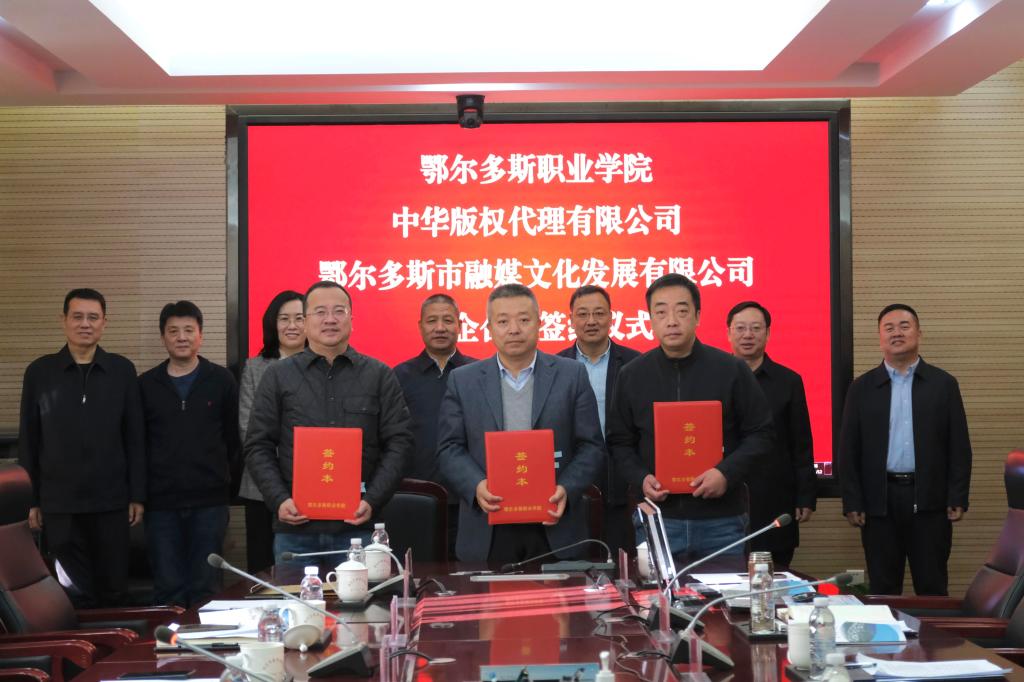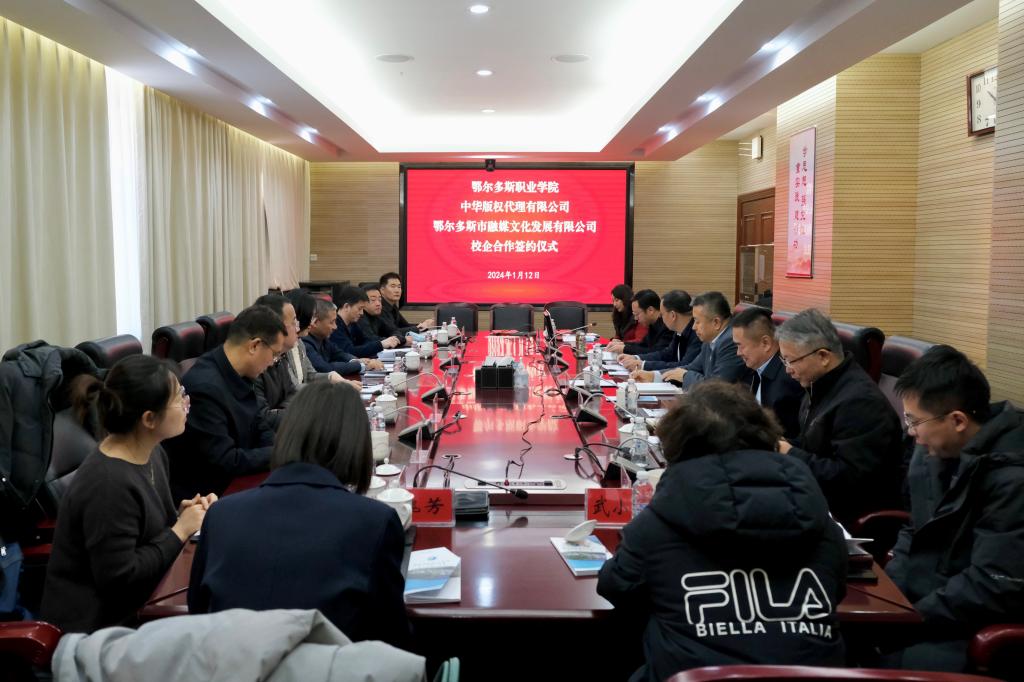 1月12日,学院与中华版权代理有限公司、鄂尔多斯市融媒文化发展有限公司举行校企合作交流座谈会暨签约仪式。中国版权保护中心办公室主任陈云,中华版权代理有限公司常务副总经理兴瑞伟、副总经理张天举,鄂尔多斯市融媒体中心党委书记、鄂尔多斯市融媒文化发展有限公司党委书记、董事长倪虹,鄂尔多斯市融媒文化发展有限公司党委副书记、总经理任君,党委委员、副总经理陈立革,党政综合部部长郝丽琴,市场运营部苏和,战略投资部魏芳,学院党委书记马建峰,党委副书记、院长张建林,党委委员、副院长任光飞,党委委员、宣传部部长兼资源工程系总支书记付瑞,信息工程系、人文管理系、建筑工程系相关负责人参加仪式。