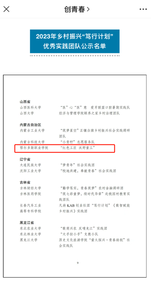 为进一步深化育人实效,强化经验总结、典型示范,经自主申报、择优推荐、组织评审等环节,共青团中央青年发展部拟表扬98个“笃行计划”专项行动优秀组织单位、95个优秀实践团队、89名优秀实践个人,我院“红色工匠 沃野重工”荣获优秀实践团队。
