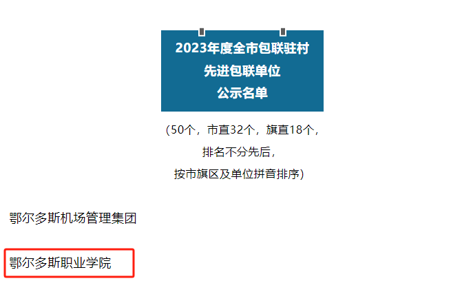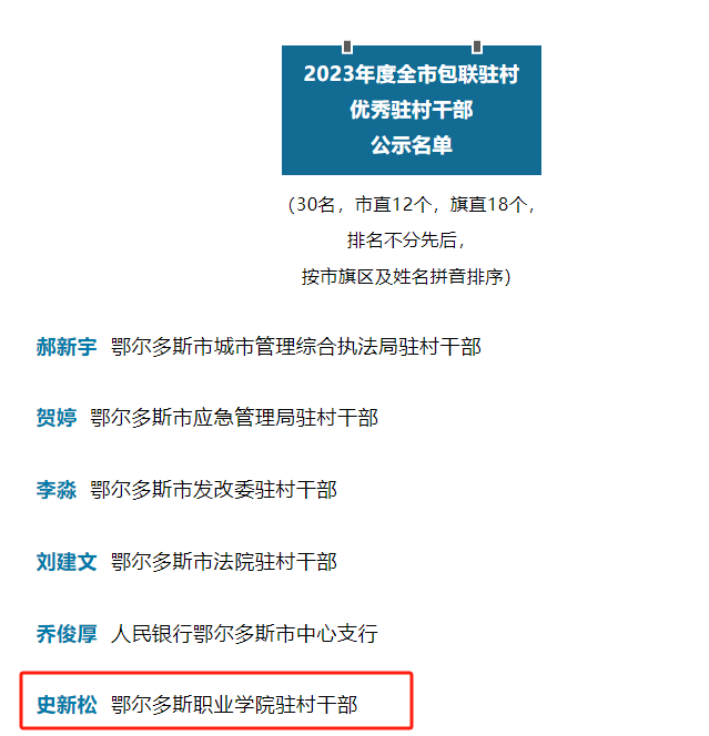 经鄂尔多斯市包联驻村工作领导小组研究,决定对2023年度鄂尔多斯市包联驻村工作对象予以通报表彰,我院被评为2023年度全市包联驻村先进包联单位,我院教师史新松被评为2023年度全市包联驻村优秀驻村干部。