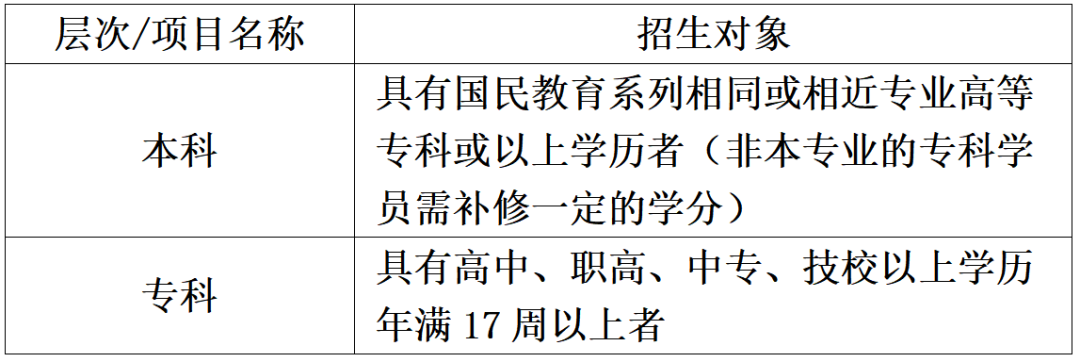 ·学生学籍自注册入学起八年内有效,专科起点本科专业、专科专业最低修业年限均为两年半。报读专升本层次的学员,需补修本科专业的基础课程(补修费按学分收费)。