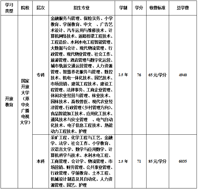 开放教育及远程教育主办院校、层次、招生专业、学制、学分、收费