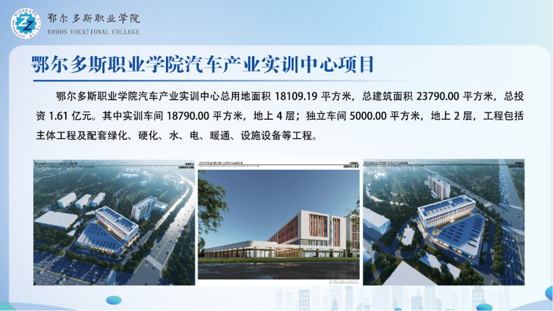 按照市委、市政府要求学院积极争取国家投资的指示,学院加大了国家资金争取力度。开云手机官方版在线入口汽车产业实训中心于2023年正式列入国家“教育强国”项目库,是鄂尔多斯市唯一列入的高校,总建筑面积2.4万平方米,总投资1.61亿元。2024年国家正式下达8000万元中央预算内投资计划。在市委、市政府的大力支持下,该项目即将于2024年10月开工建设,为国庆再增添一抺亮色!