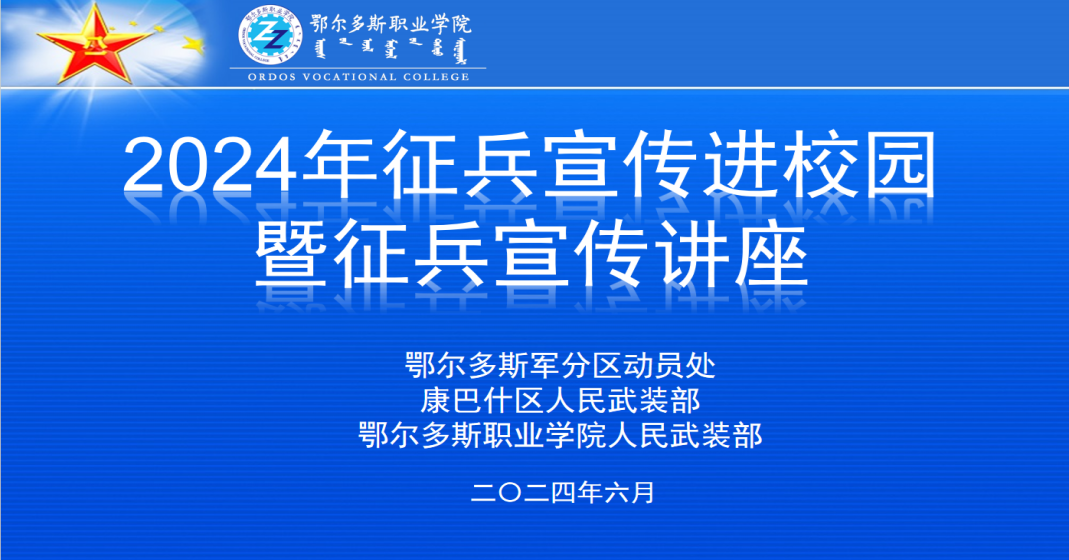 为进一步做好我院2024年下半年征兵宣传工作,以“感党恩、听党话、跟党走”为主题,全面营造校园良好国防教育氛围,加强学生国防观念、夯实国防教育基础、扩大征兵宣传覆盖面和影响力,6月5日下午,院党委学生工作部联合康巴什区征兵办公室在500人报告厅开展以“建功军营、筑梦青春”为主题的征兵宣传专题讲座。康巴什区人民武装部参谋武云、党委学生工作部全体人员、各系学工科相关负责人、各系辅导员、各系学生共500人参加活动。
