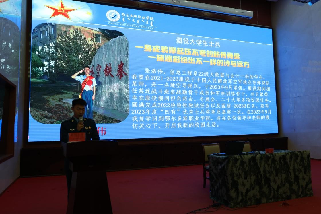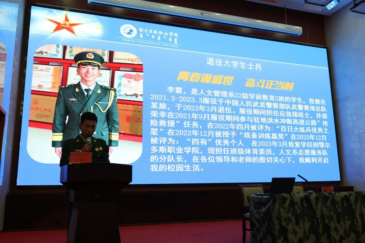我院退役大学生士兵代表上台进行宣讲,他们结合自身入伍经历,分享了热血故事,充分发挥身边人、身边事的优秀榜样,提升了在场同学的参军热情。
