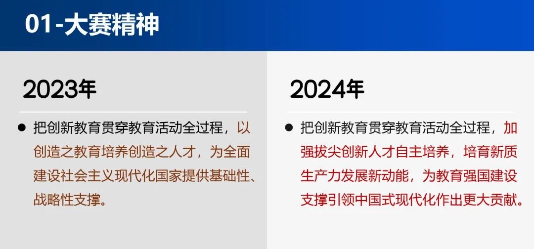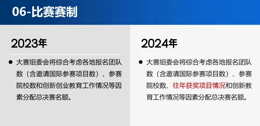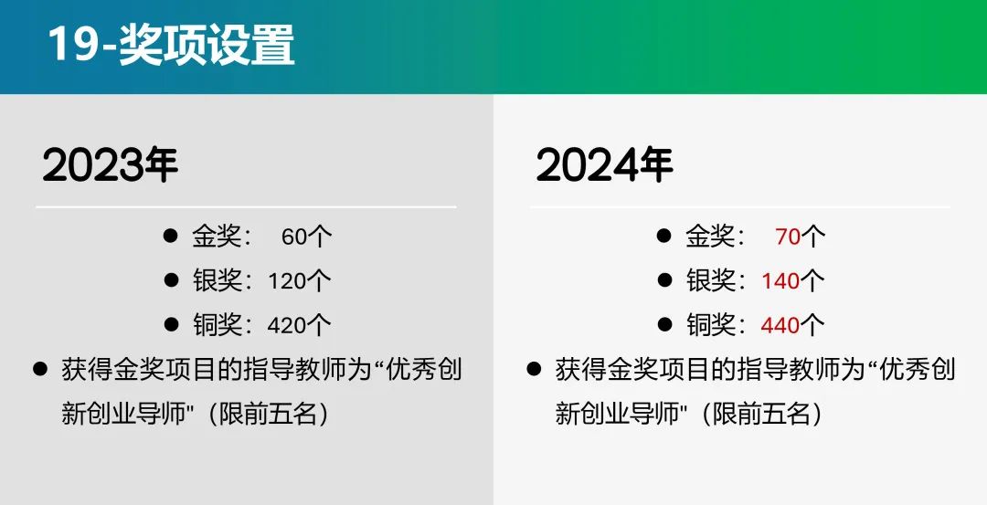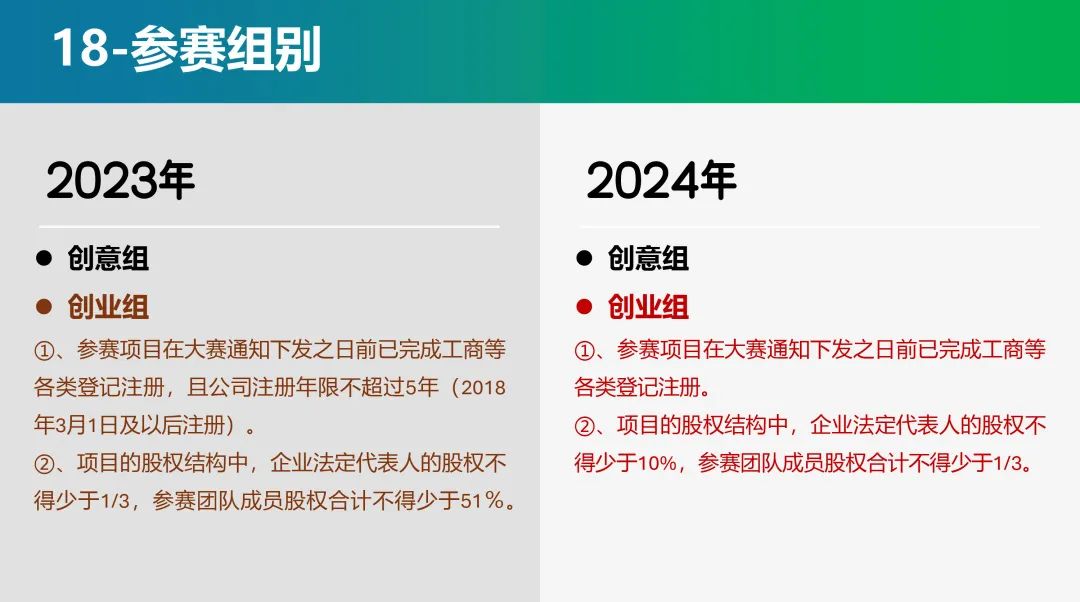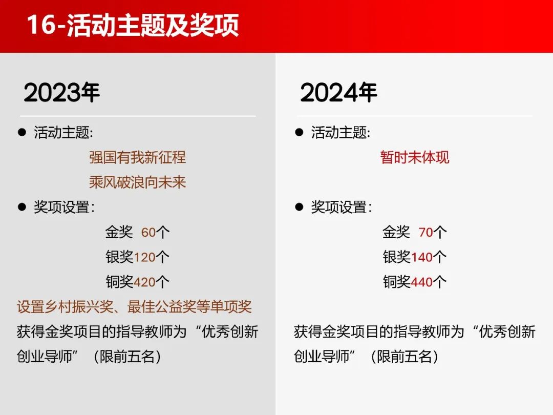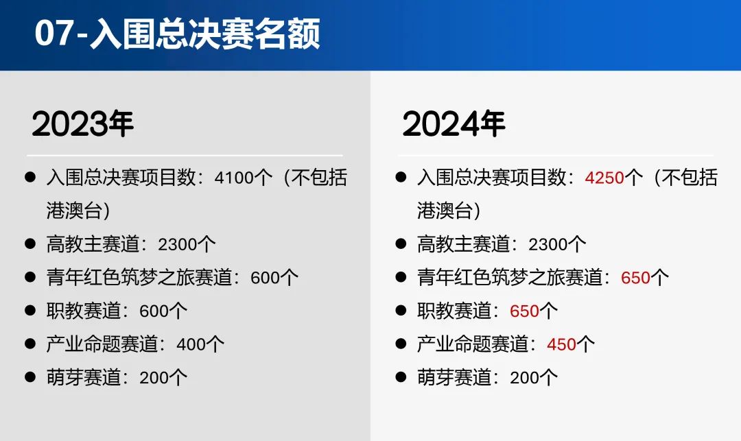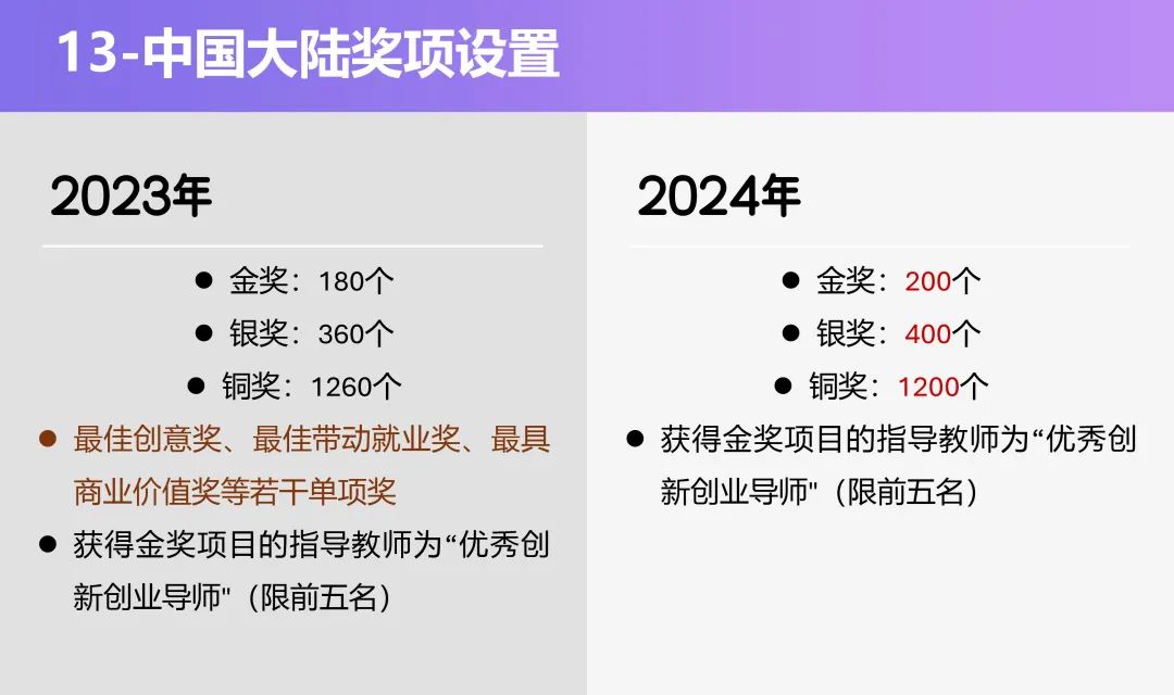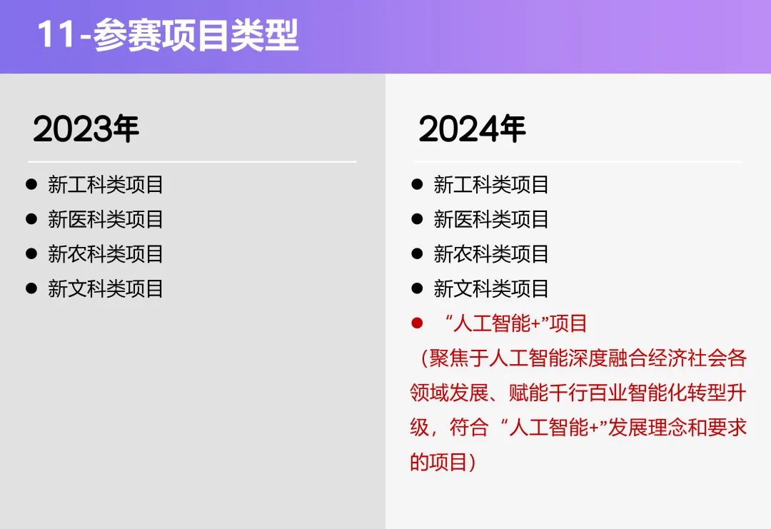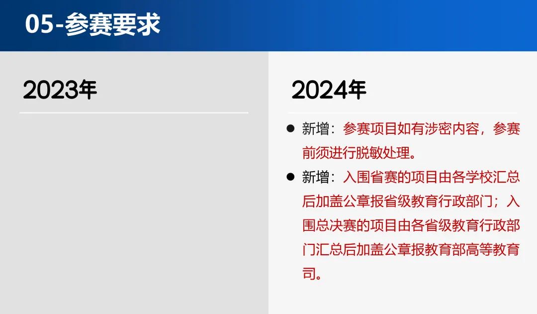 4月28日,《教育部关于举办中国国际大学生创新大赛(2024)的通知》正式发布,本期小助手根据本届大赛通知内容,相比去年的变化进行了重点对比如下: