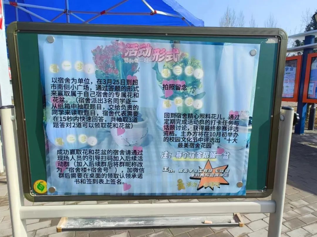 依托“3·25”心理健康宣传活动周,学生工作部在学生社区组织开展“3·25 善爱我——我和花儿共成长”宿舍园艺赛启动活动。师生通过参与答题认养绿植,并进行后续的每周打卡,最后参加“十大最美宿舍花园”评选。本次活动约400名师生直接参与其中,活动覆盖范围近千人。本次活动旨在让学生美化宿舍环境的同时,达到提升心理健康素养的目的,并将美育与劳动教育孕育其中,引导师生树立“生命在我手中”的生命观。