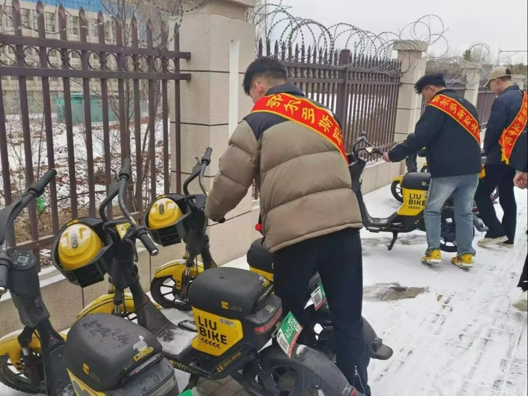 建筑工程系组织学生志愿者开展整理乱停乱放共享电瓶车的志愿服务活动。