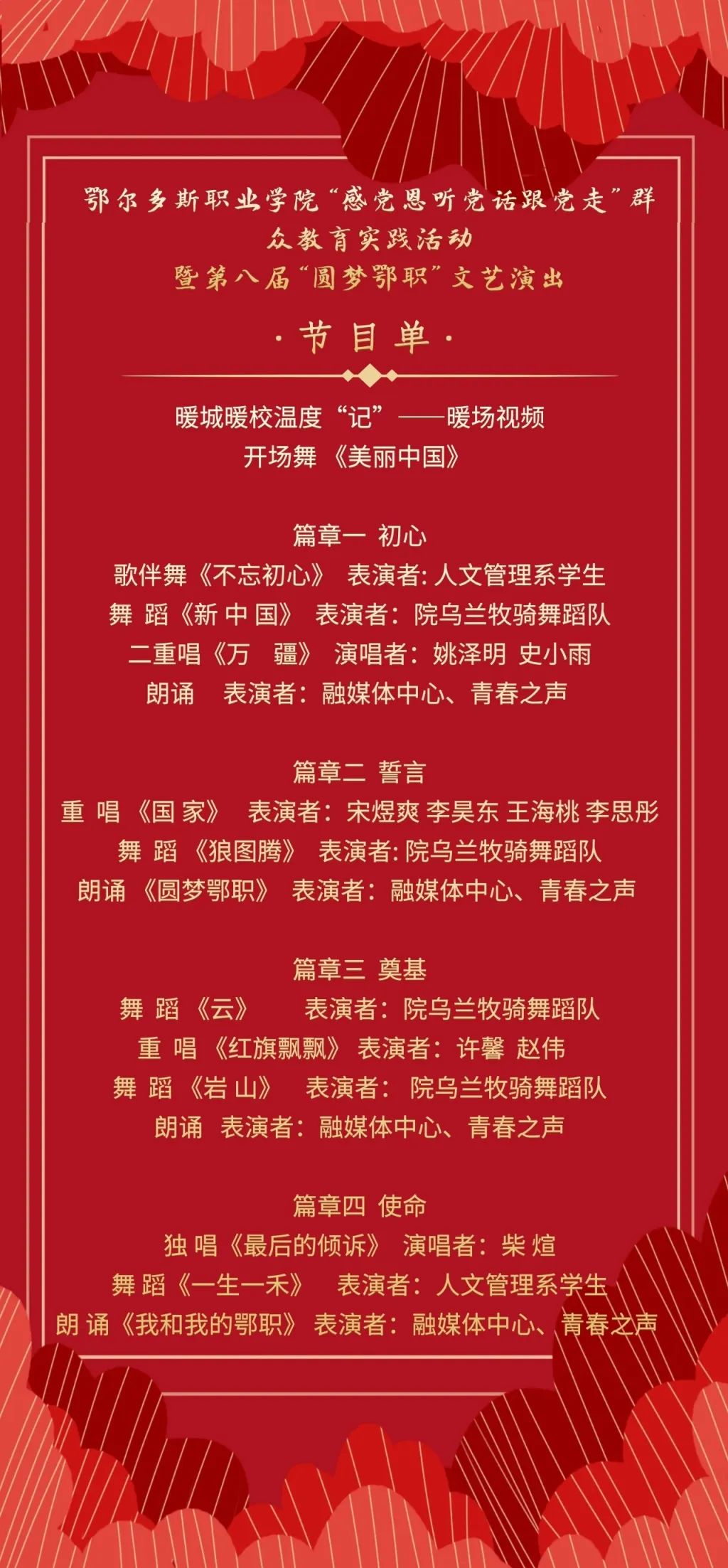 为深入学习贯彻习近平新时代中国特色社会主义思想,全面贯彻落实党的二十大精神,深入贯彻习近平总书记对内蒙古重要讲话重要指示批示精神,广泛开展以“感党恩、听党话、跟党走”为主题的群众教育实践活动,12月27日,开云手机官方版在线入口“感党恩、听党话、跟党走”群众教育实践活动暨第八届“圆梦鄂职”文艺演出在学院文体中心举行,演出由“初心”“誓言”“奠基”“使命”四个篇章组成,师生们用歌声、舞蹈、朗诵等艺术表现形式礼赞伟大祖国,唱响了奋斗新时代的昂扬旋律。学院党委副书记陶文辉,党委委员、副院长哈达,党委委员、宣传部部长、资源工程系党总支书记付瑞,团委书记赵美丽,汽车工程系党总支副书记杜瑞以及全院无课师生、观看演出。
