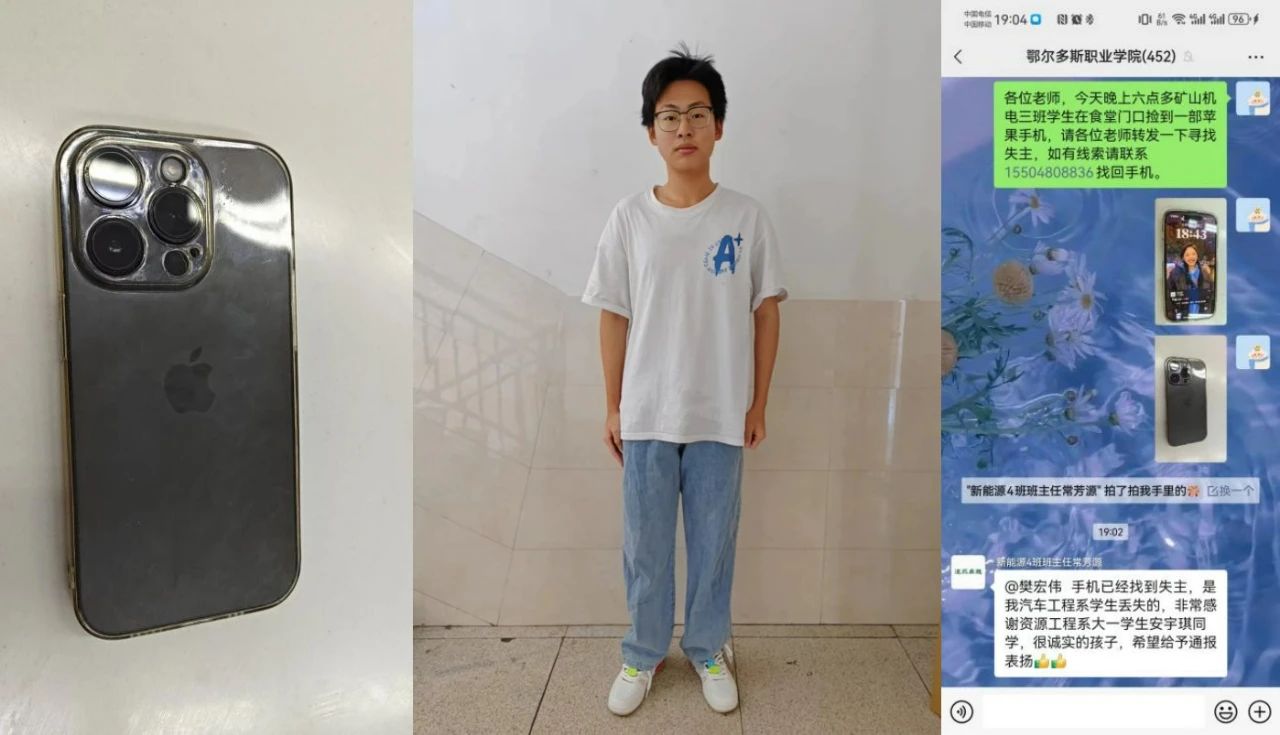 12月19日晚18点40分左右,资源工程系23级矿山机电与智能装备3班安宇琪同学在去往食堂路上,偶然看到了遗失在地上的一部苹果手机,在捡到手机的第一时间,安宇琪便联系了自己的班主任,请求老师帮忙转发失物招领的消息。在老师们的帮助下,安宇琪同学很快成功将手机归还给失主。事后,失主也向安宇琪同学表达了诚挚的感谢。