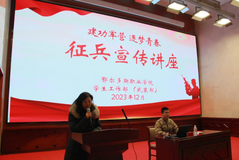 12月21日,学院学生工作部(武装部)在报告厅举行“建功军营 筑梦青春”征兵宣传讲座,市军分区动员处参谋裴越、康巴什区武装部参谋武云、学院学生工作部征兵工作人员、各系部辅导员、各系学生代表共计500人参加讲座。