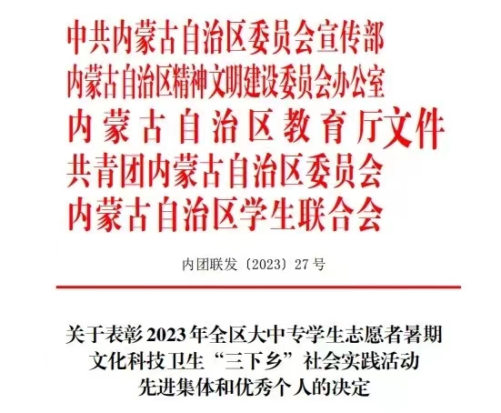 近日,自治区团委公布了《关于表彰2023 年全区大中专学生志愿者暑期文化科技卫生“三下乡”社会实践活动先进集体和优秀个人的决定》,对活动中表现突出的优秀单位、团队和个人进行表彰。我院荣获优秀组织奖,另有2个团队和15名个人受到表彰。