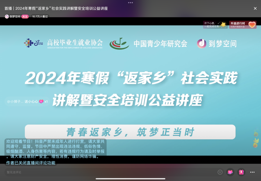 为深入学习宣传贯彻党的二十大精神,贯彻落实习近平总书记关于青年工作的重要思想,切实做好“返家乡”“三下乡”高校社会实践各项工作,大力培育和践行社会主义核心价值观,加强优秀传统文化教育,弘扬和培育民族精神,高校毕业生就业协会、中国青少年研究会、到梦空间联合在2024年寒假前夕再度举办“返家乡”社会实践讲解暨安全培训公益讲座。公益讲座共举办四期,截至2024年1月7日,我院参与学生三千多名,获得高校师生的一致好评。