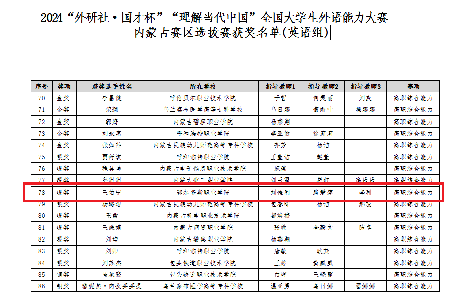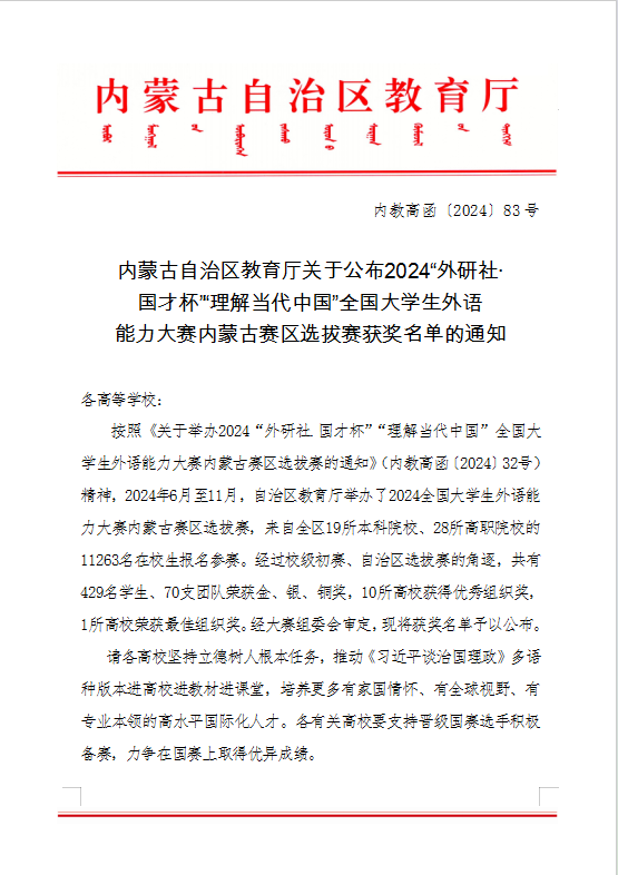 在内蒙古教育厅主办,外语教学与研究出版社和内蒙古大学联合承办的2024“外研社·国才杯”“理解当代中国”全国大学生外语能力大赛内蒙古赛区的选拔赛中,我院6位同学在英语综合能力(高职组)和演讲比赛(高职组)两个赛项中斩获1银5铜的好成绩。