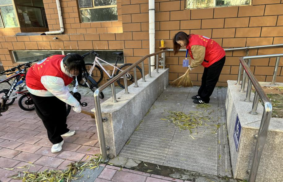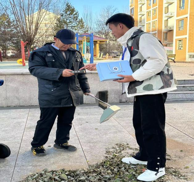 活动伊始,志愿者们在康巴什区红五星退役军人志愿服务队刘金平队长带领下进行了细致的分工,活动过程中,志愿者们携带扫帚、耙子、手套等清洁工具清理社区道路上的垃圾和落叶,还深入绿化带,细心地堆积落叶,捡拾隐藏在草丛中的废弃物;此外,志愿者们还将带来的小礼物送给了社区居民及环卫工人。