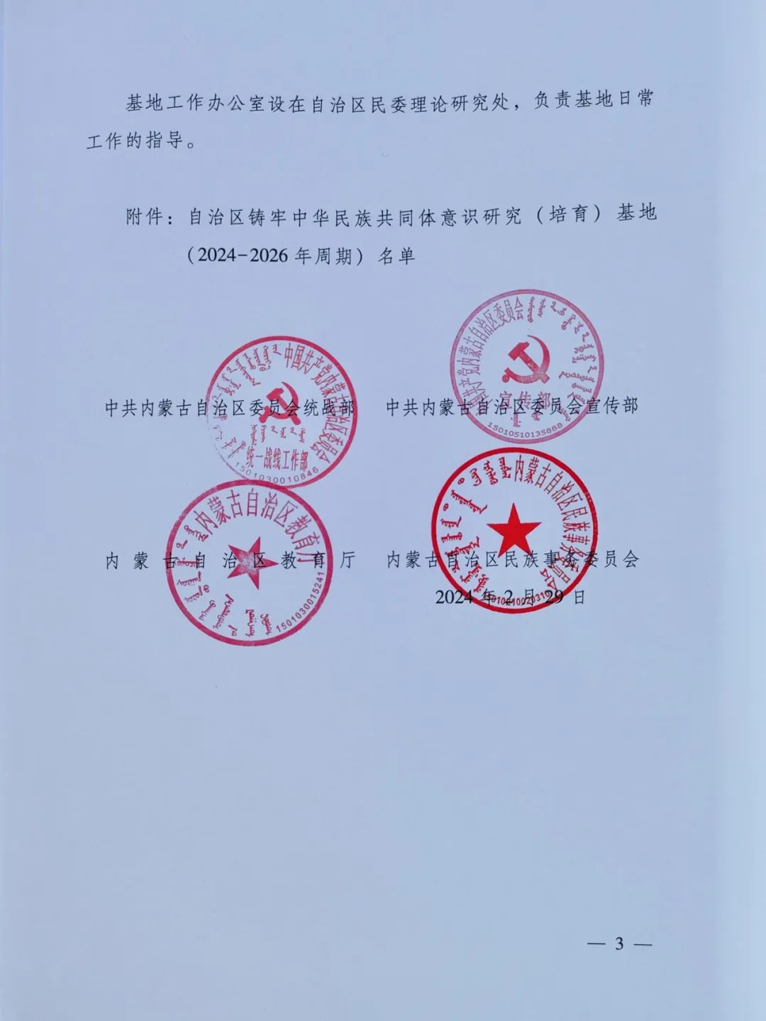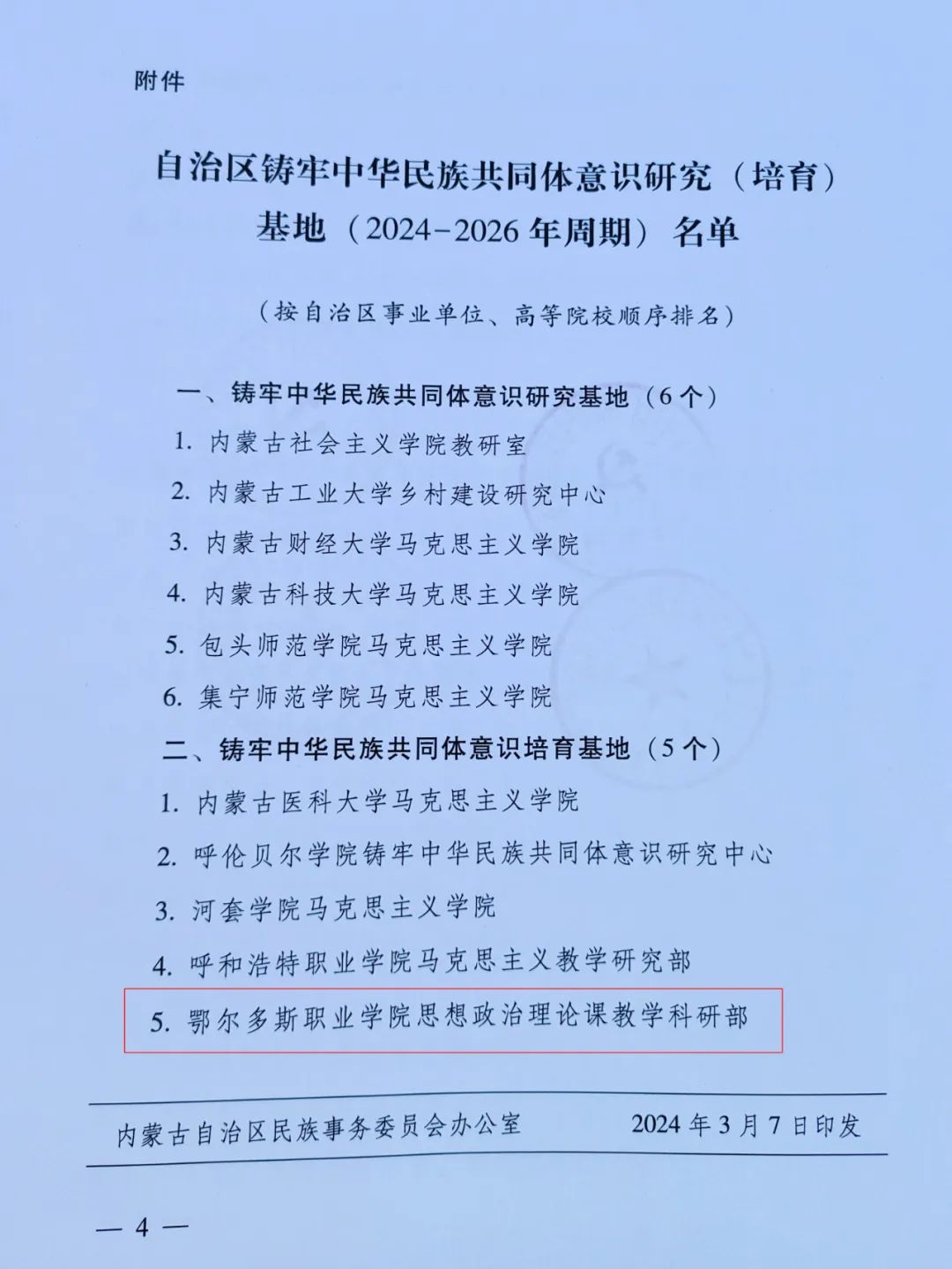 4月11日,全区铸牢中华民族共同体意识研究基地、教育实践基地建设暨《中华民族共同体概论》教材推广使用工作会议在呼和浩特召开。学院党委书记马建峰、思政部负责人前往参会。会上举行第一批全区铸牢中华民族共同体意识教育实践基地、自治区铸牢中华民族共同体意识研究(培育)基地(2024-2026 年周期)授牌仪式,我院获批自治区铸牢中华民族共同体意识研究(培育)基地。