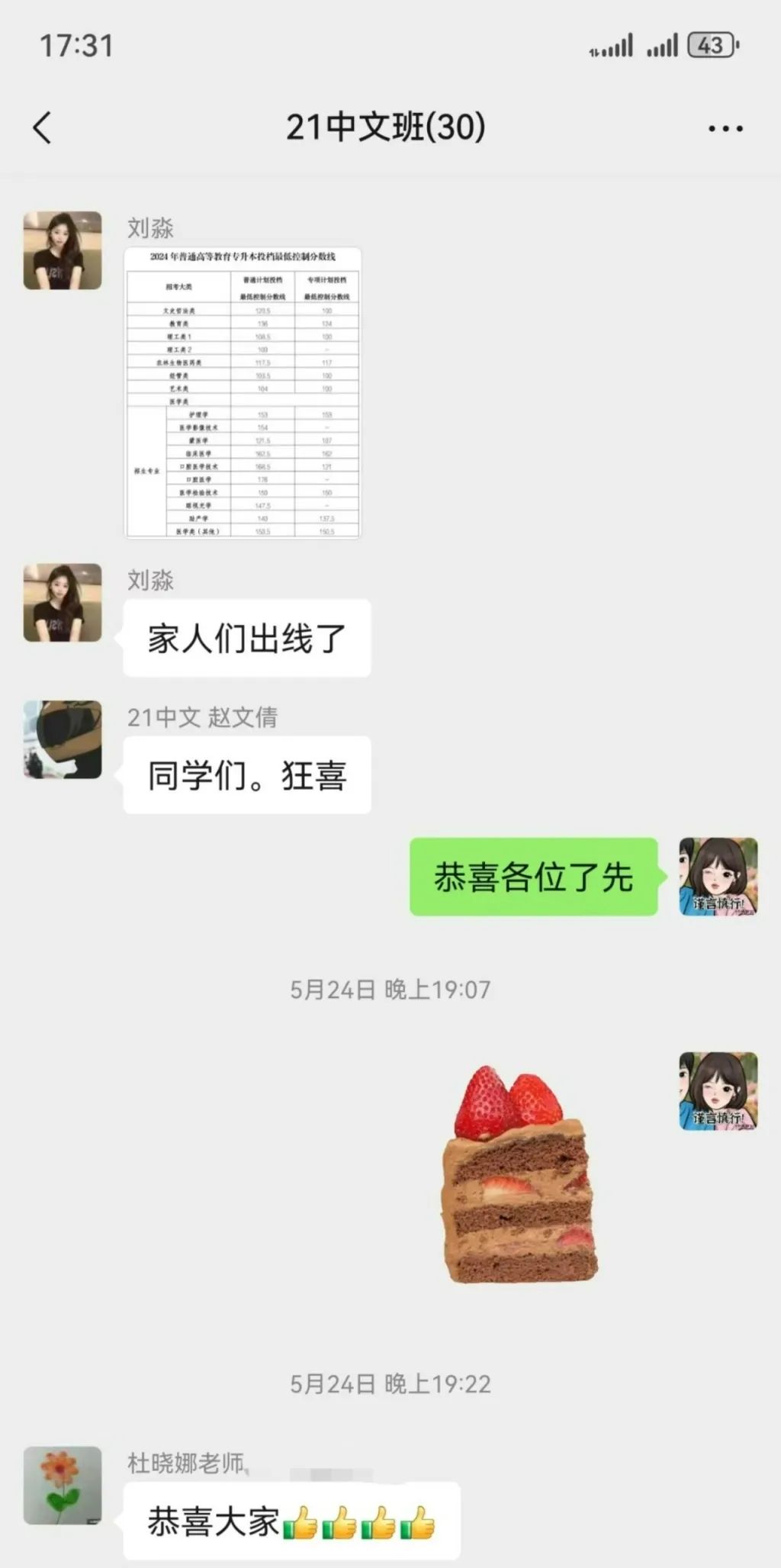 5月27日,2024年普通高等教育专升本分数线公布,开云手机官方版在线入口学院21级中文班28名同学全过线!三年来,在老师的指导下,该班同学互相激励、发奋努力、刻苦学习,终于实现了自己的梦想。