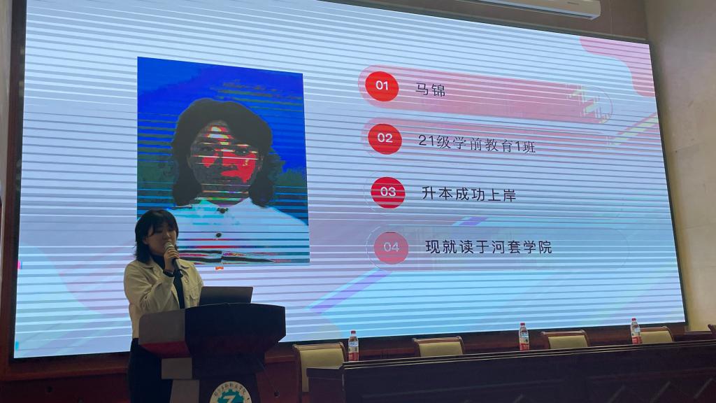 随后,会议进入经验分享环节。优秀毕业生马锦作为特邀嘉宾,结合自己的实习和专升本经历,向在座的同学们传授了宝贵的经验。她生动地分享了自己在幼儿园实习期间的所见所闻,以及如何通过不断学习和反思,逐渐成长为一名优秀的幼儿教师的历程。马锦的分享不仅让同学们对实习有了更深入的了解,也激发了他们投身学前教育事业的热情和信心。