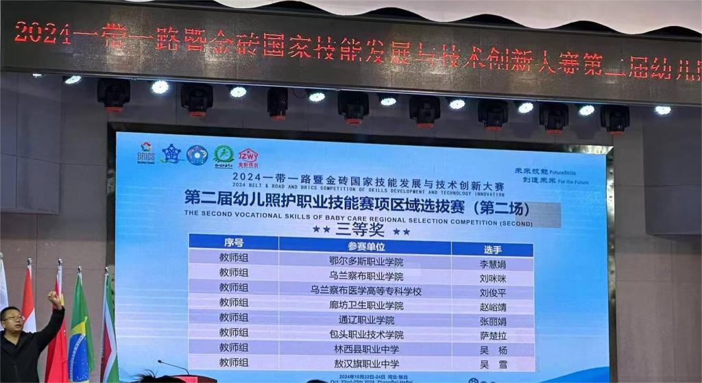 近日,在刚刚落幕的2024一带一路暨金砖国家技能发展与技术创新大赛第二届幼儿照护职业技能赛项区域选拔赛——高校学生赛与教师赛中,我系派出的参赛选手吴雨洋、马小玲获得高校组学生赛三等奖;高校教师赛中我系教师郝欣、李慧娟分别获得二等奖和三等奖,郝欣老师成功晋级2024一带一路暨金砖国家技能发展与技术创新大赛国赛,期待国赛再创佳绩!