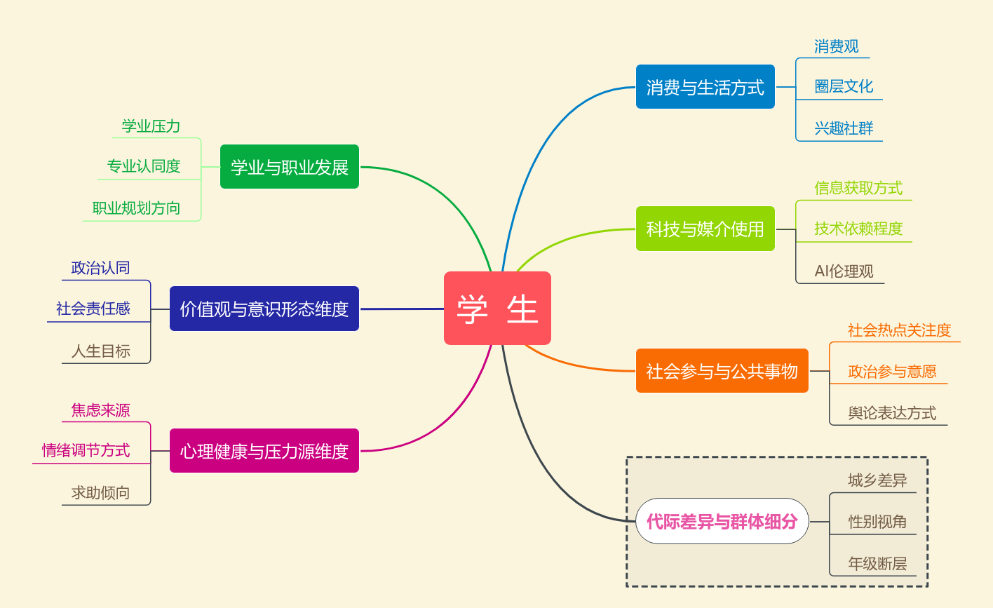 经过一番研讨,大家得出了解学生的七个维度的共识是:要了解学生的价值观与意识形态、了解学生学业与职业发展的规划、了解学生消费与生活方式、了解学生对科技与媒介的使用情况、了解学生的心理健康与压力来源、了解学生社会参与与公共事务意识、了解学生的代际差异与群体分化。如此,学生才能成为一个完整而全面的人的形象,而不是一个平面的简单的名字。