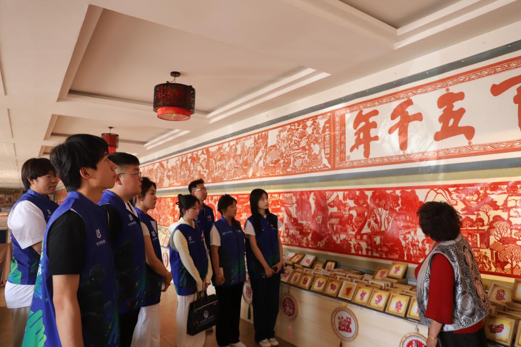 “一纸之隔,便是千年。”队员们踏入古色古香的文化院时,自治区级非遗传承人赵美玲(人称“赵大剪”)正执剪刀在红宣纸上勾勒纹样。刀锋过处,纸屑簌簌如落英。她以“镂金作胜传荆俗,翦彩为人起晋风”的诗句为引,向众人娓娓道来剪纸技艺的前世今生:从母亲手中的窗花手艺到自己四十载刀耕不辍,从田间地头的生活记录到脱贫攻坚的时代剪影,她的剪刀始终贴着土地生长。“每张剪纸都是会说话的地方志。”队员们凝神细观,在老人指尖翻飞间,各类元素跃然纸上,深切体悟到“非遗不是博物馆里的陈列品,而是流淌在生活中的文化基因”。
