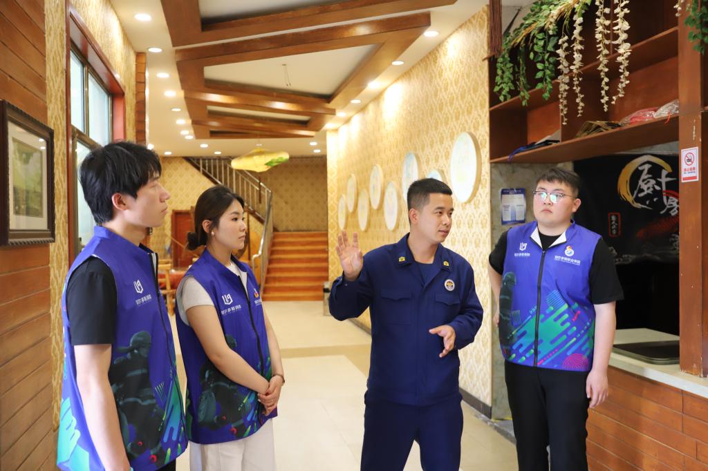午后,项目组成员与消防队组成“文化+消防”双宣小组,深入周边村落开展安全服务。在达拉特旗“赵大剪”文化大院,队员们手持消防宣传手册,向村民讲解“厨房用火‘三清三关’”;消防员则携带设备,为老旧民居排查电气线路隐患。发现院内电线杂乱时,他们当即提醒村民整改,防患于未然。文化院广场上,消防员通过灭火器操作演示与知识问答互动,将“隐患险于明火,防范胜于救灾”的理念深植村民心间。