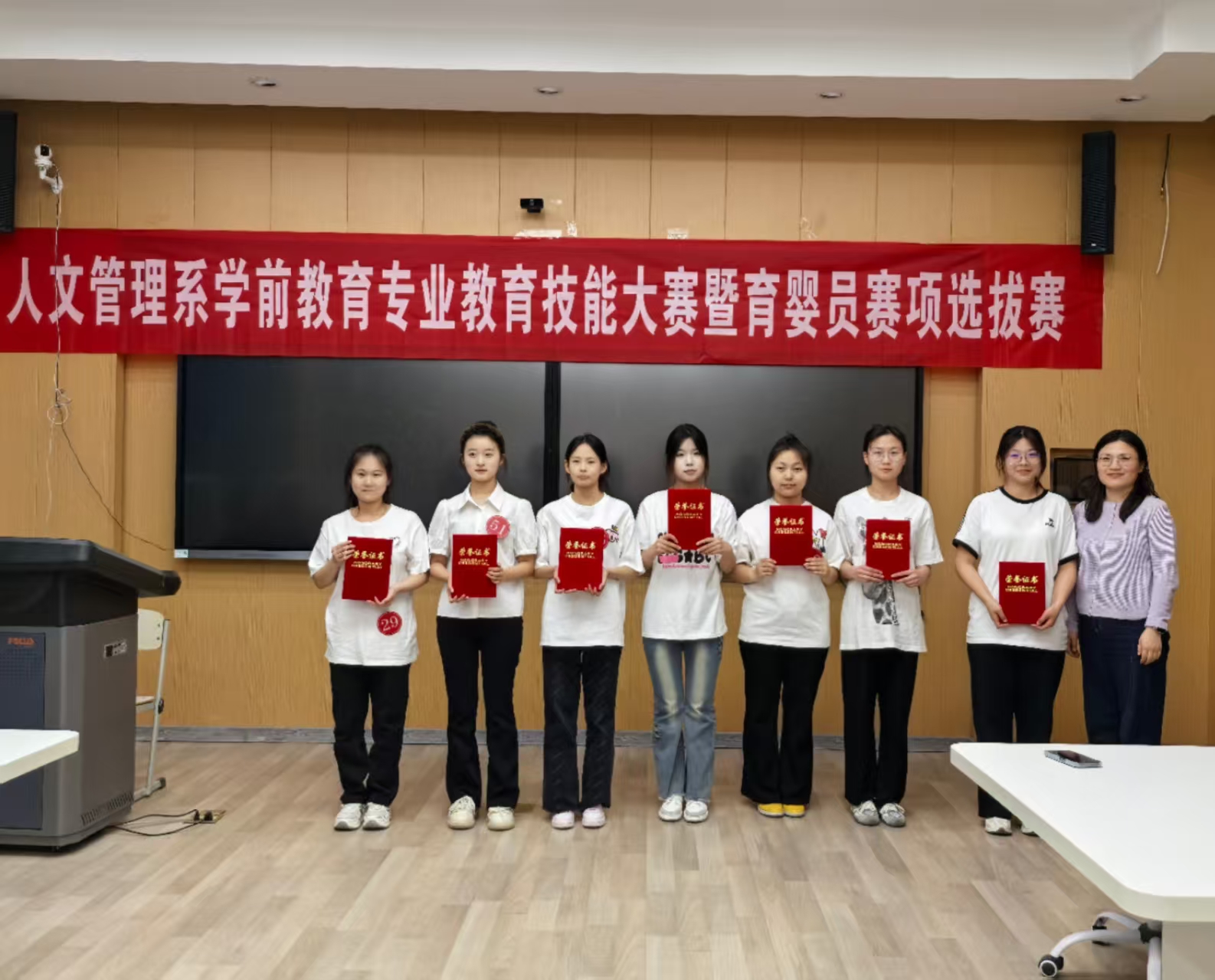 1. 技能大赛赛项:涵盖教学设计、模拟教学、幼儿歌曲弹唱、歌表演、故事讲述等核心环节,全面考察选手综合教学能力。选手们于当日13:55在教学楼114教室候考签到。下图为签到、抽签现场: