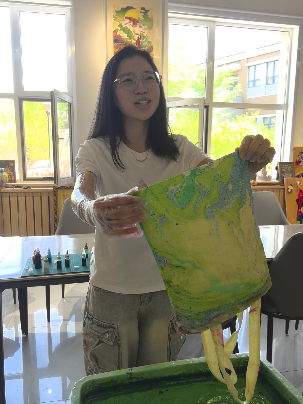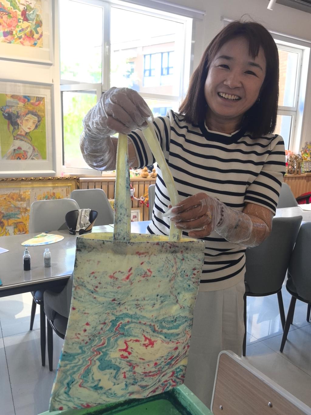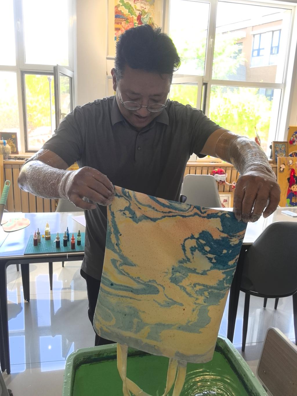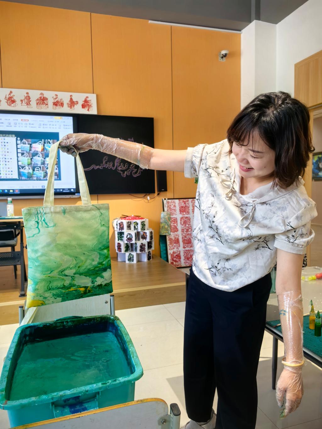 活动的高潮是独具创意的“漆包创作”体验环节。教师们将颜料滴入清水,观察色彩在水中晕染、交融,再将素色布包缓缓浸入,通过控制角度与力度,让天然纹理在布料上自然成形。随着水波轻摇,一幅幅独一无二的“水中画”跃然包面,或如泼墨山水,或似抽象肌理。“没想到非遗技艺能如此‘年轻化’,创作过程既治愈又充满惊喜!”参与教师们展示着亲手制作的漆纹手包,喜悦之情溢于言表。