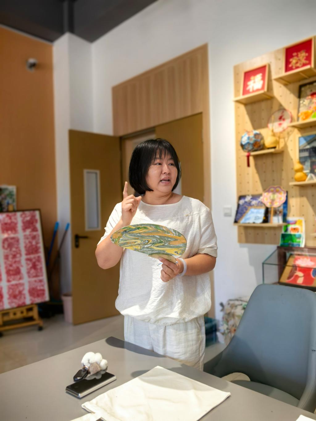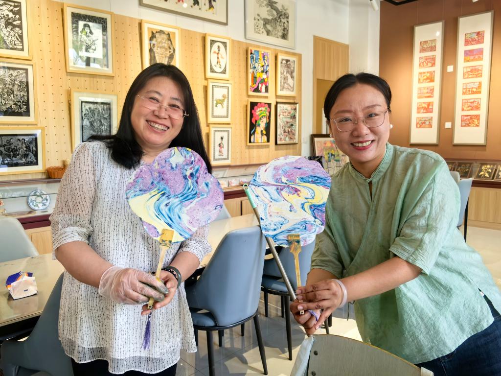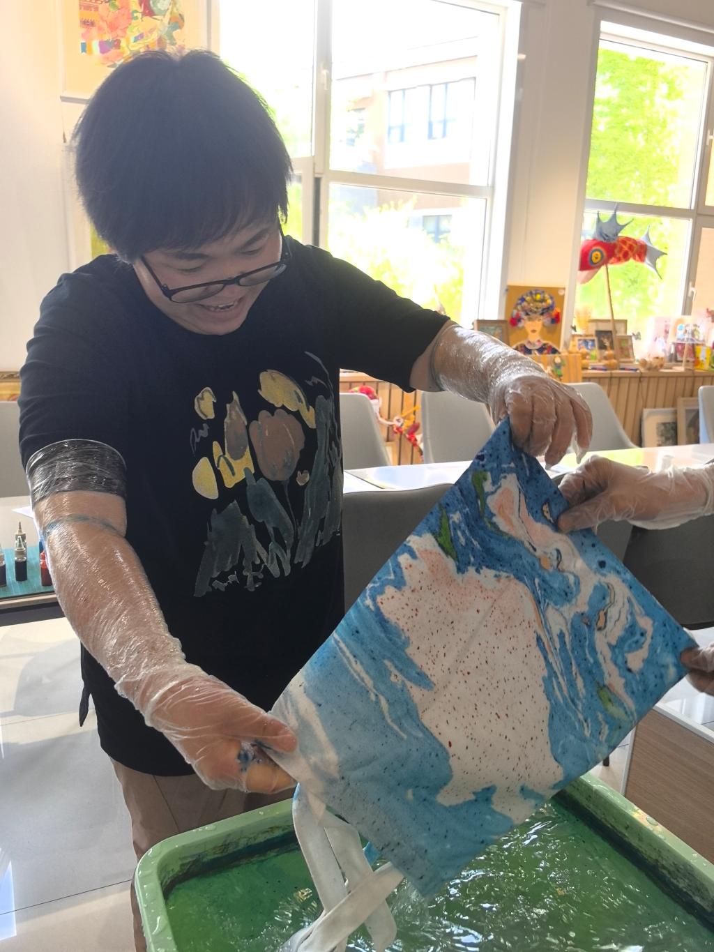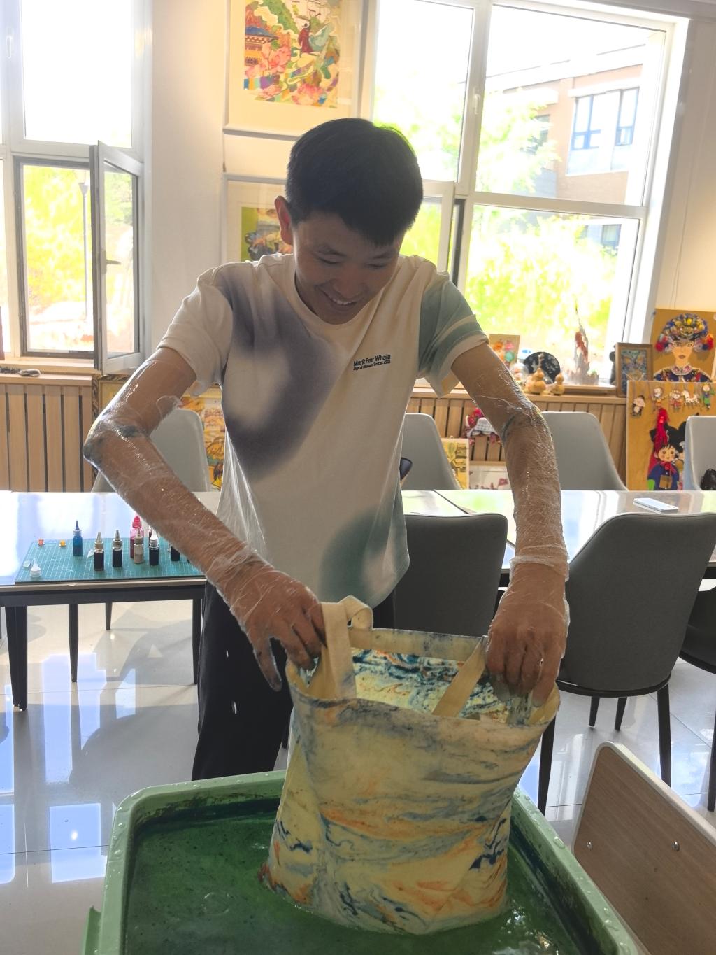 活动的高潮是独具创意的“漆包创作”体验环节。教师们将颜料滴入清水,观察色彩在水中晕染、交融,再将素色布包缓缓浸入,通过控制角度与力度,让天然纹理在布料上自然成形。随着水波轻摇,一幅幅独一无二的“水中画”跃然包面,或如泼墨山水,或似抽象肌理。“没想到非遗技艺能如此‘年轻化’,创作过程既治愈又充满惊喜!”参与教师们展示着亲手制作的漆纹手包,喜悦之情溢于言表。