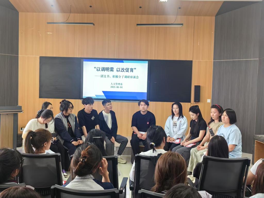 为深入倾听师生诉求,提升育人服务效能,构建良性师生互动生态,构建良性师生互动生态,切实将教育管理做到学生心坎上,人文管理系组织召开“以调明需 以改促育”系列专题调研座谈会。6月4日下午,人文管理系第五场调研座谈会暨全系团支书、积极分子调研座谈会在教学楼216顺利召开。