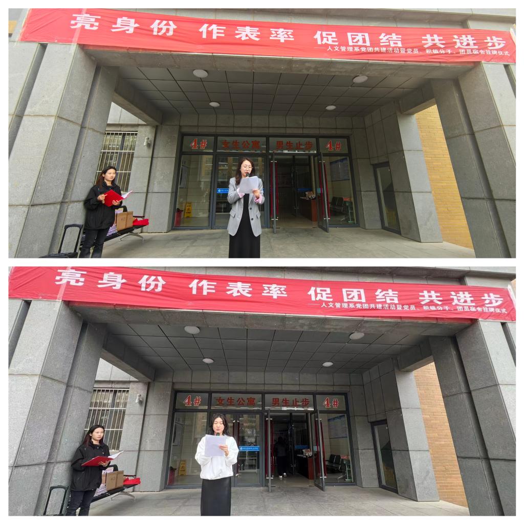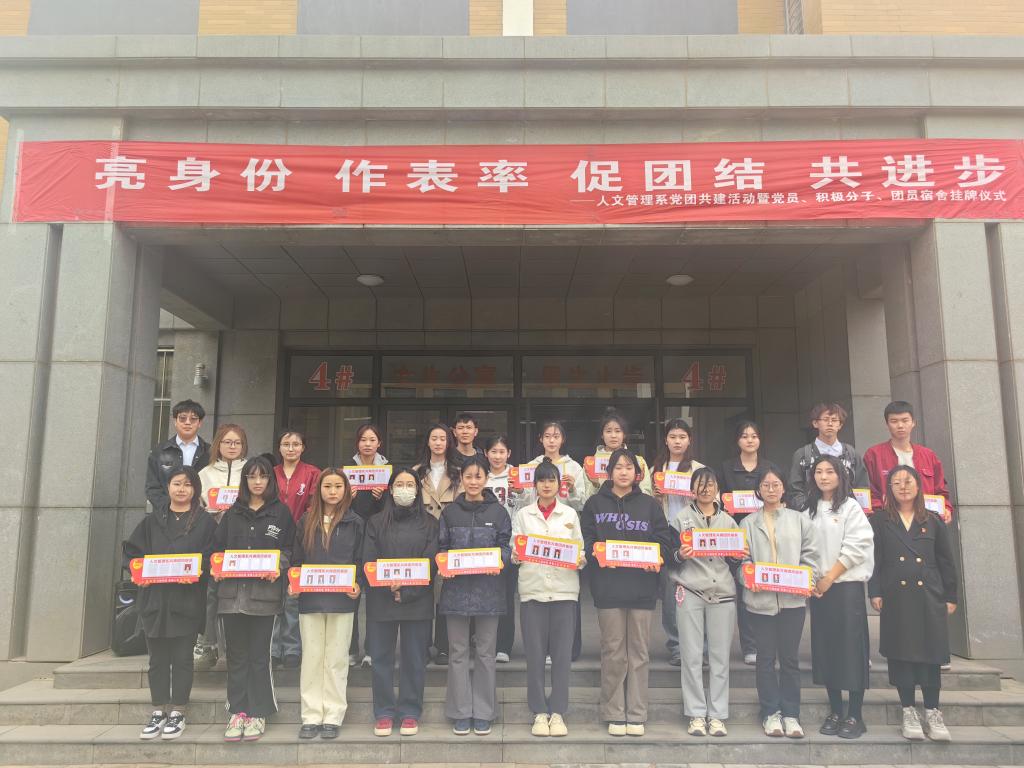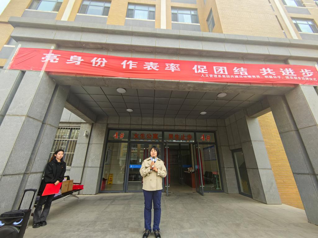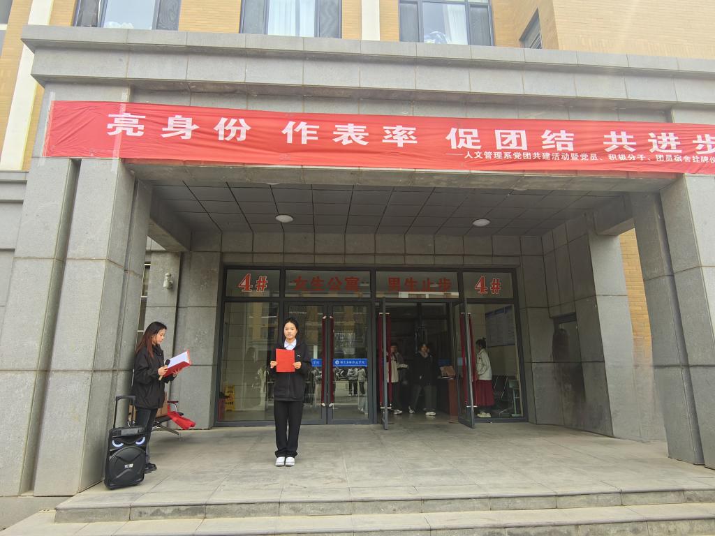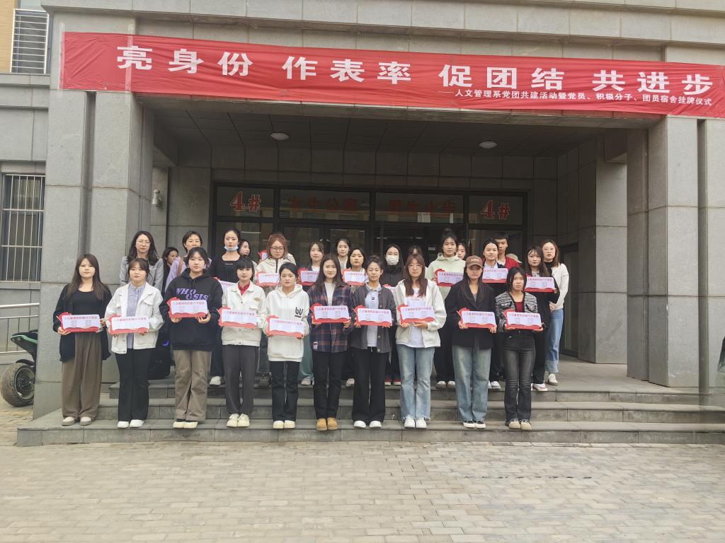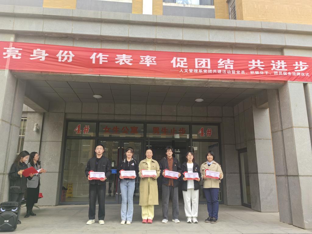为进一步推动党建进宿舍工作,扎实推进党建带团建、团建促党建工作走深走实,着力提升宿舍管理质量与宿舍文化建设水平,人文管理系充分发挥系部学生党员、入党积极分子及共青团员的模范带头与示范作用,2024年4月9日,系党总支学工支部联合系团总支开展“亮身份 作表率 促团结 共进步”学生党员、入党积极分子及共青团员宿舍挂牌仪式暨主题党日、团日活动。人文管理系党总支副书记高慧,学生与综合管理科副科长、学工支部书记段泳遥,人文管理系团总支书记孙诗嘉,人文管理系学工支部全体党员、积极分子及各班级团员与学生代表参与此次活动。