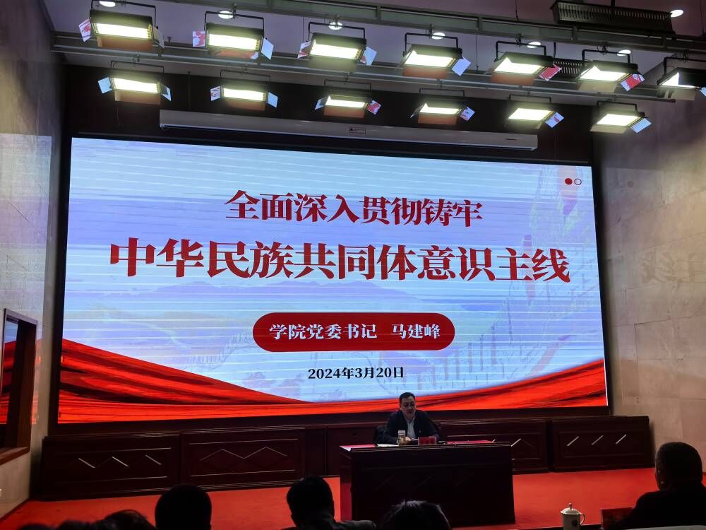 马建峰围绕深刻认识全面深入贯彻落实铸牢中华民族共同体意识的极端重要性、全面掌握中华民族共同体意识的丰富内涵和准确把握全面深入贯彻铸牢中华民族共同体意识主线的实践途径分别进行论述,他结合社会时事热点、自身工作经历以及校园实践案例等深入浅出地讲解,他要求学院各族师生在鄂职大家庭中要像石榴籽一样紧紧抱在一起,心往一处想,劲往一处使,切实铸牢中华民族共同体意识,踔厉奋发、笃行不怠,努力维护学院民族团结和校园和谐稳定。