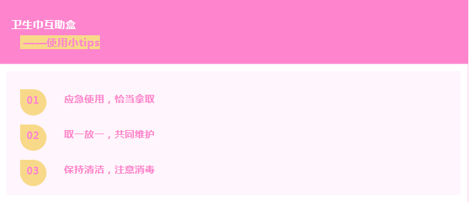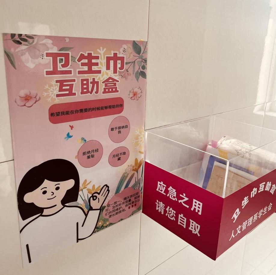 我们已将卫生巾放入盒中,方便各位小仙女取用,以备不时之需。同时,希望各位小仙女取用后进行及时补充,将这份温暖传递下去,共同营造和谐互助的氛围.