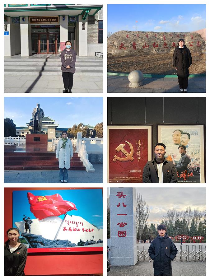 在外实习预备党员能够按照支部学习安排,充分利用空闲时间前往鄂尔多斯革命历史博物馆、老经棚展室、五原抗战纪念园、宁城县红色文化公园、大青山红色文化公园、集宁战役纪念馆、巴林左旗林东镇烈士陵园、乌兰夫纪念馆等红色教育基地,接受文化洗礼与熏陶。
